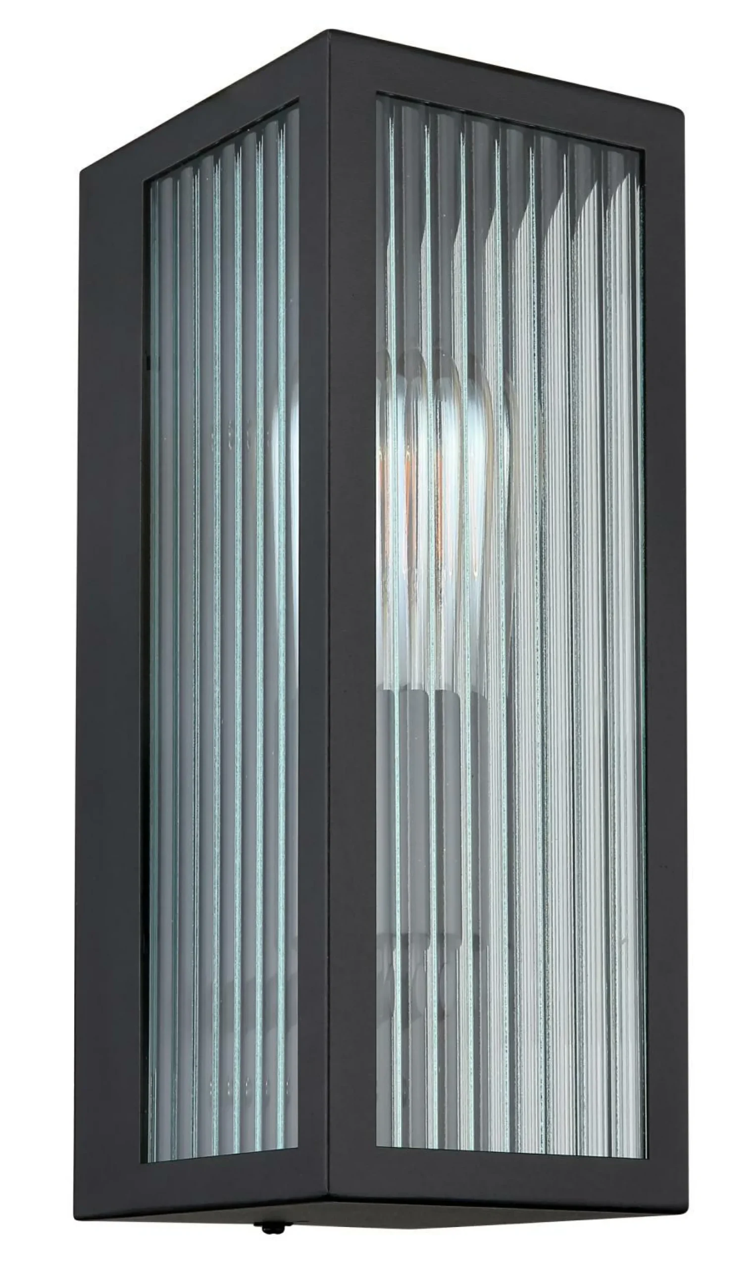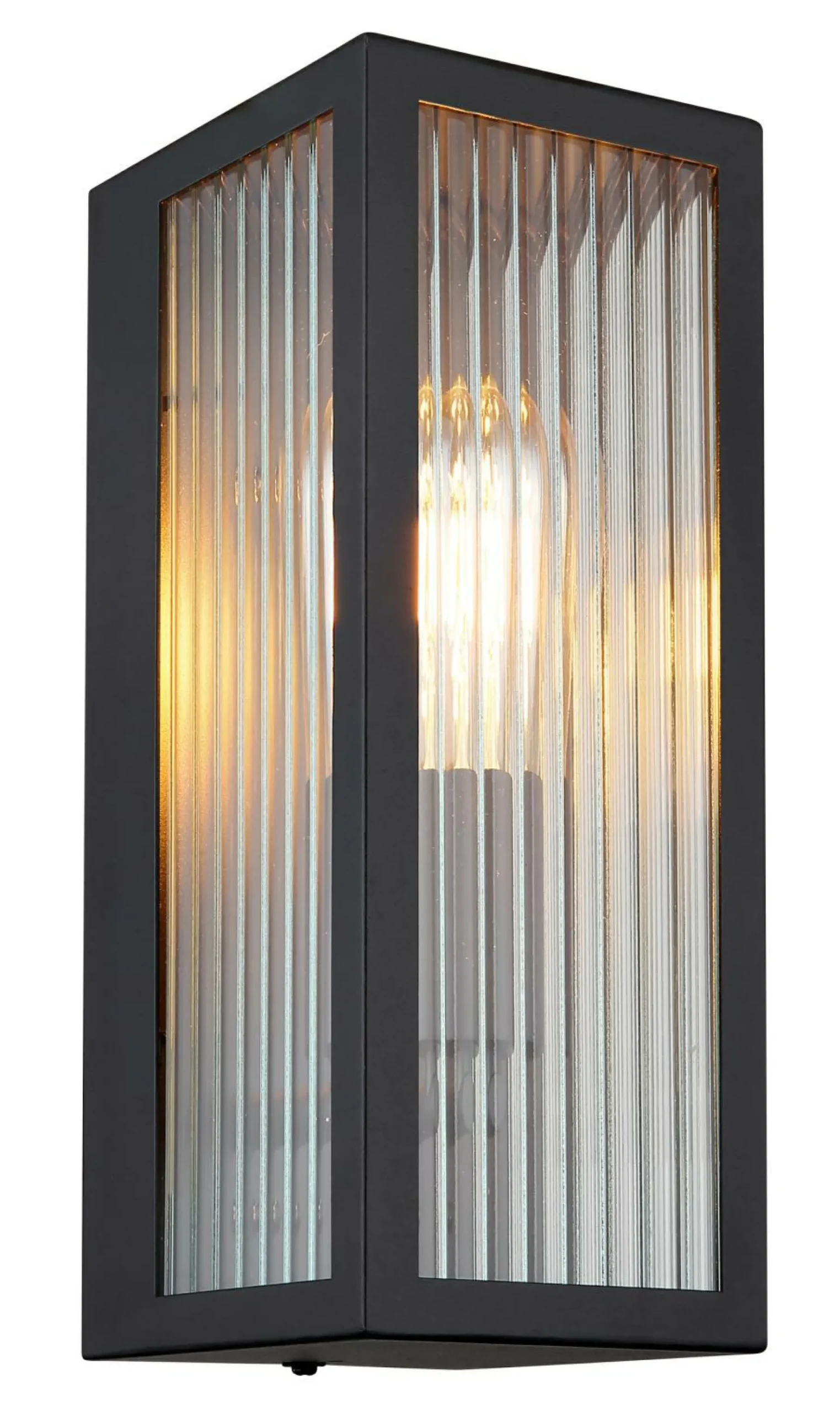 · Diese moderne Außenleuchte überzeugt durch Ihr schönes Design aus Glas und Metall. Die Leuchte in Schwarz besteht aus einem rechteckigen Metallkäfig (12x32cm) und einer schönen Glaswand mit Verzierungen an jeder Seite. Die E27 Fassung ermöglicht Ihnen Lichtfarbe und Helligkeit bis zu einer maximalen Leitung von 60 Watt, selbst zu bestimmen. Der Schutzgrad IP44 gegen Spritzwasser sorgt das Anbringen der Leuchte im Außenbereich.
