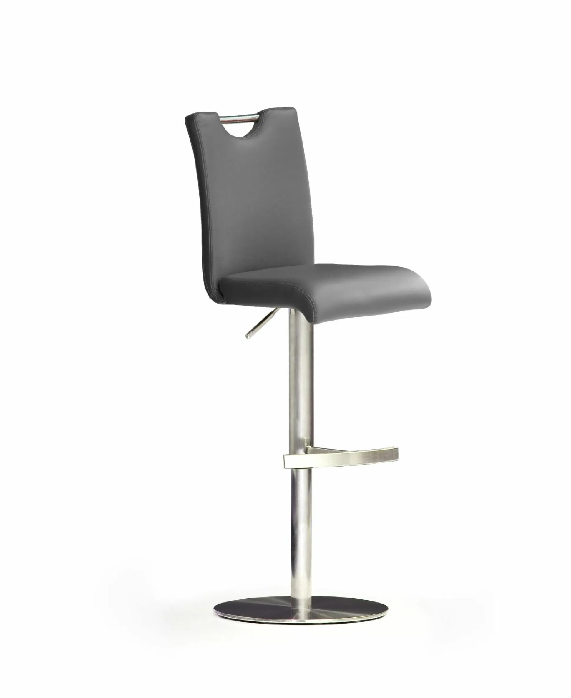 Bezug Kunstleder grau Gestell Edelstahl gebürstet ummantelt Standteller: Ø 41,5 cm, verchromt 360° drehbar Höhenverstellbar von ca. 91-116 cm Gasdruckfeder