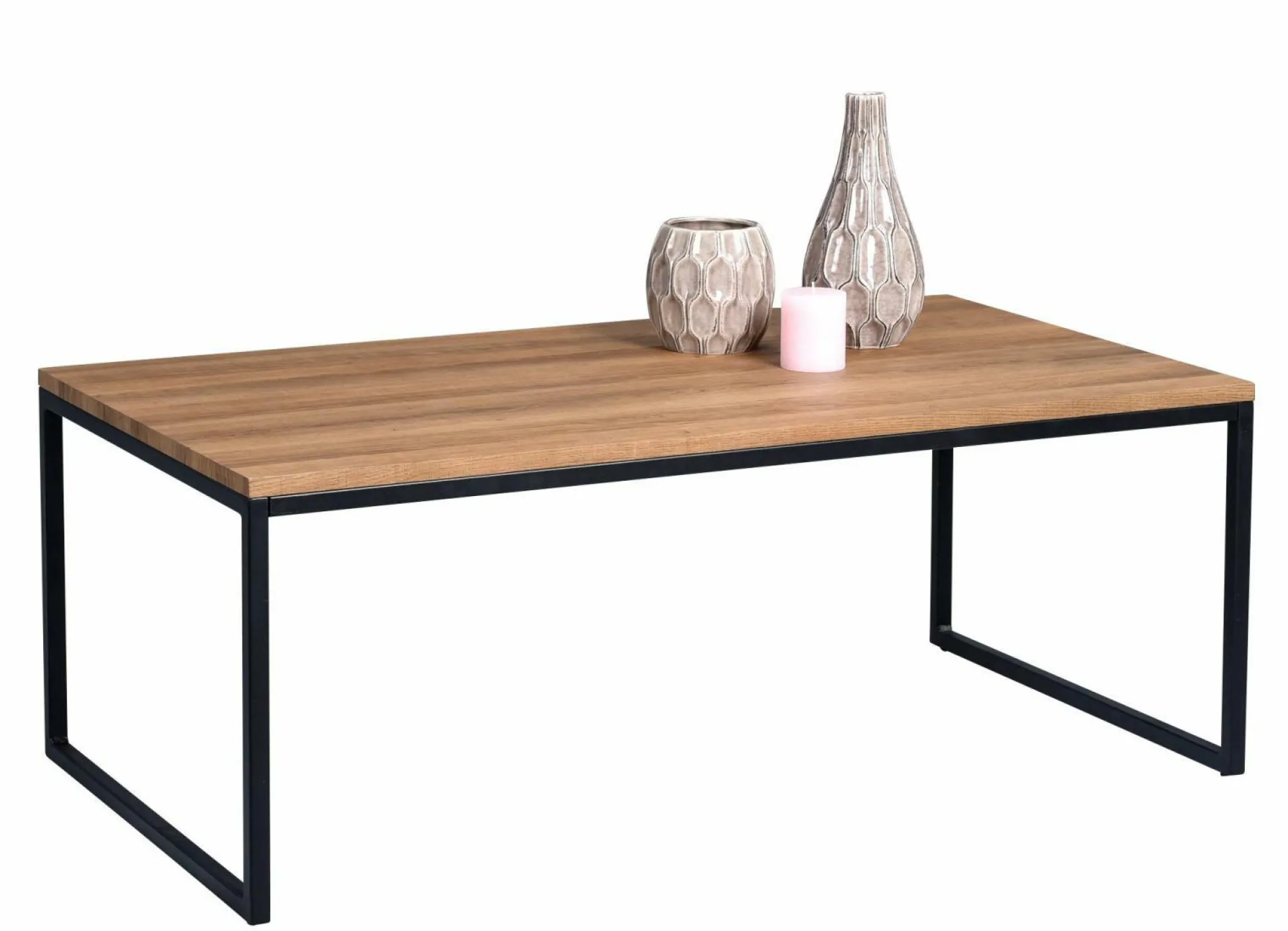 Der geradlinige Tisch verfügt über ein Gestell aus schwarzem Metall und trägt eine robuste Tischplatte aus MDF Dekor Eiche.