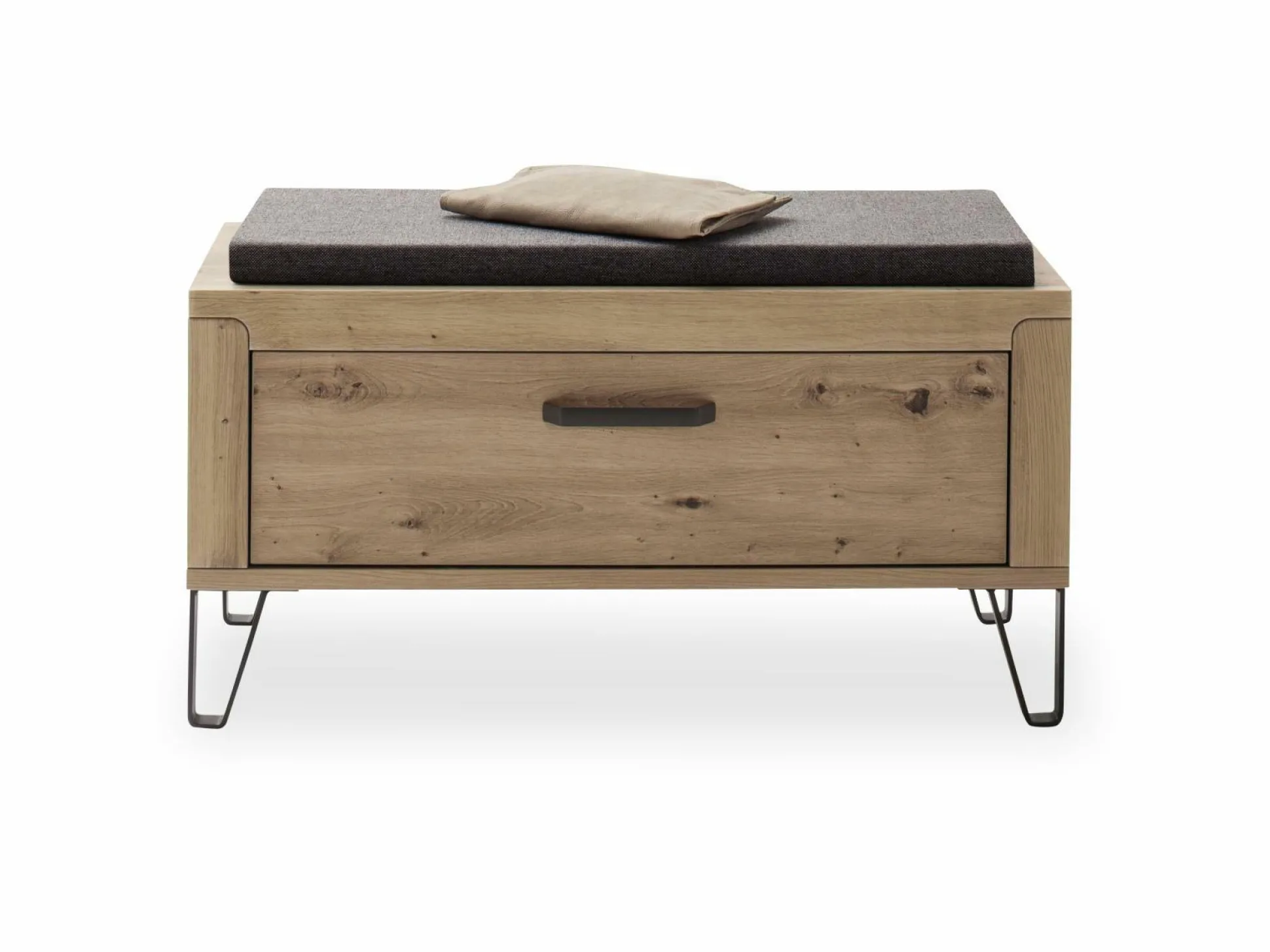 Die Garderobenbank Incata von vito erscheint in einem klar konzipierten, modernen Design. Das Element besteht dabei aus Balkeneiche Melamin Nachbildung mit Absetzungen in Oxid Melamin Nachbildung und wird von einem dezenten Gestell abgerundet. Hinter einer Klappe bietet die Bank Platz zum Verstauen von Schuhen. So bleibt der Eingangsbereich ordentlich und Sie erhalten eine praktische Sitzgelegenheit zum Anziehen der Schuhe.