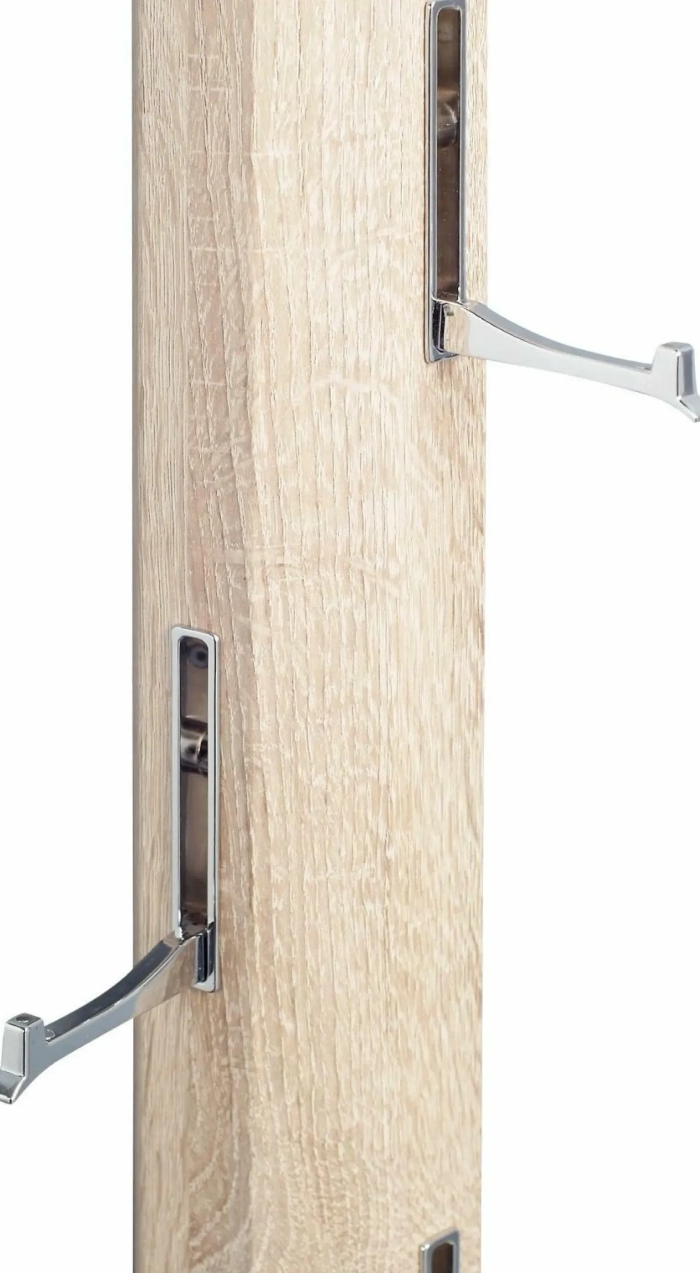 Die Garderobe Palo überzeugt durch ihr minimalistisches Design. Sie besteht aus MDF und präsentiert sich in Sonoma Eiche. Die fünf Haken bestehen aus Metall und sind verchromt. Zudem ist die Garderobe klappbar und kann platzsparend verstaut werden.