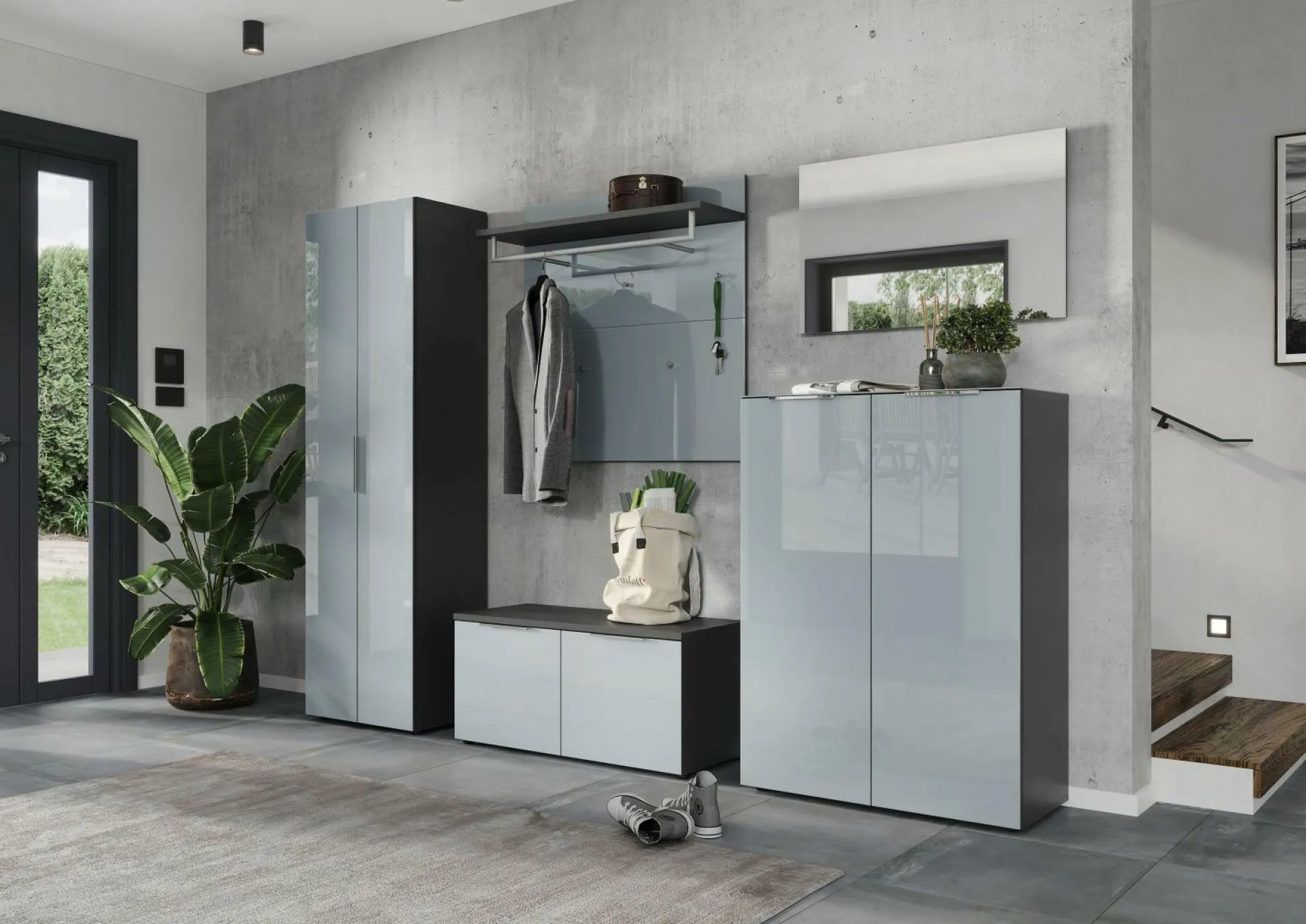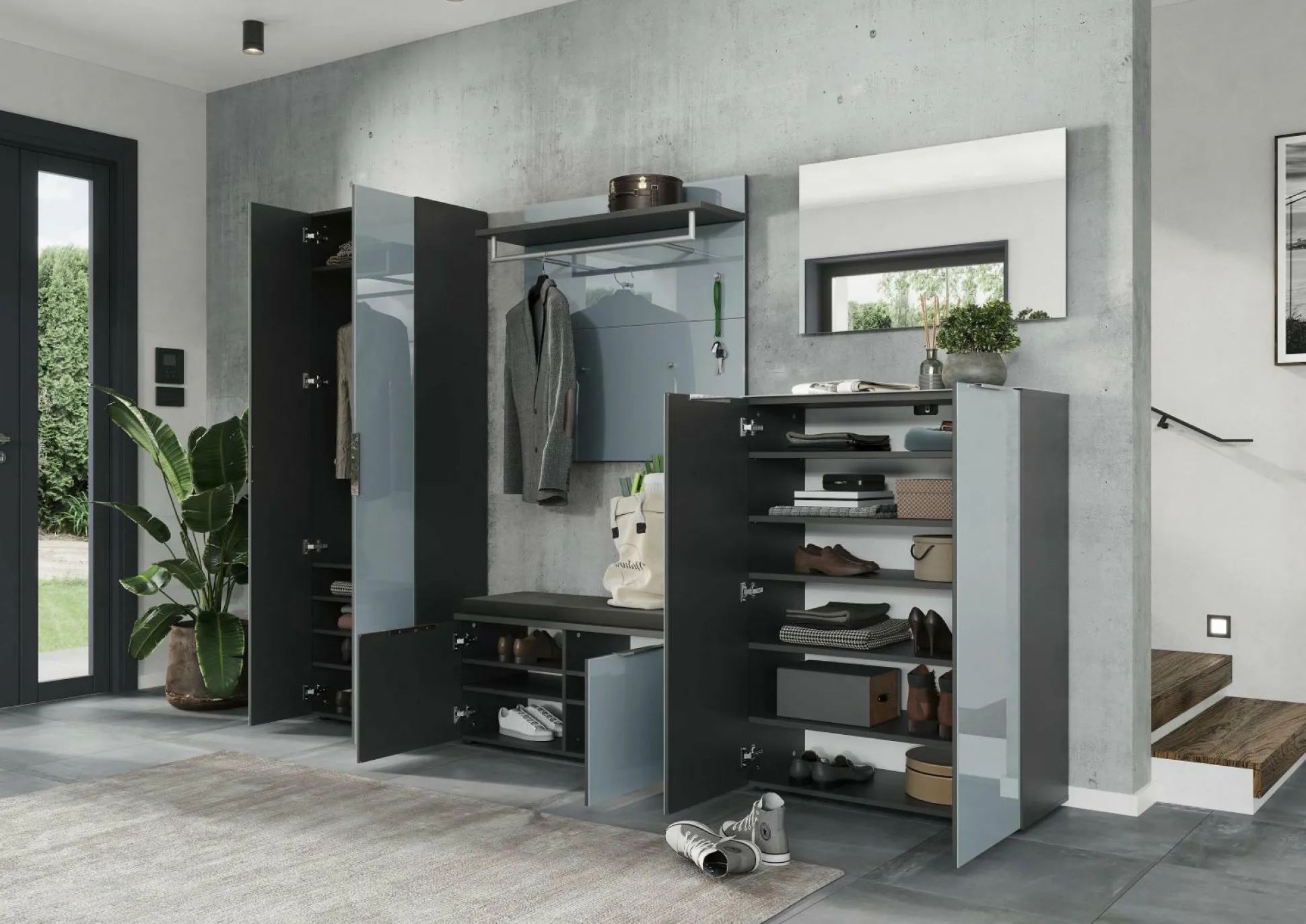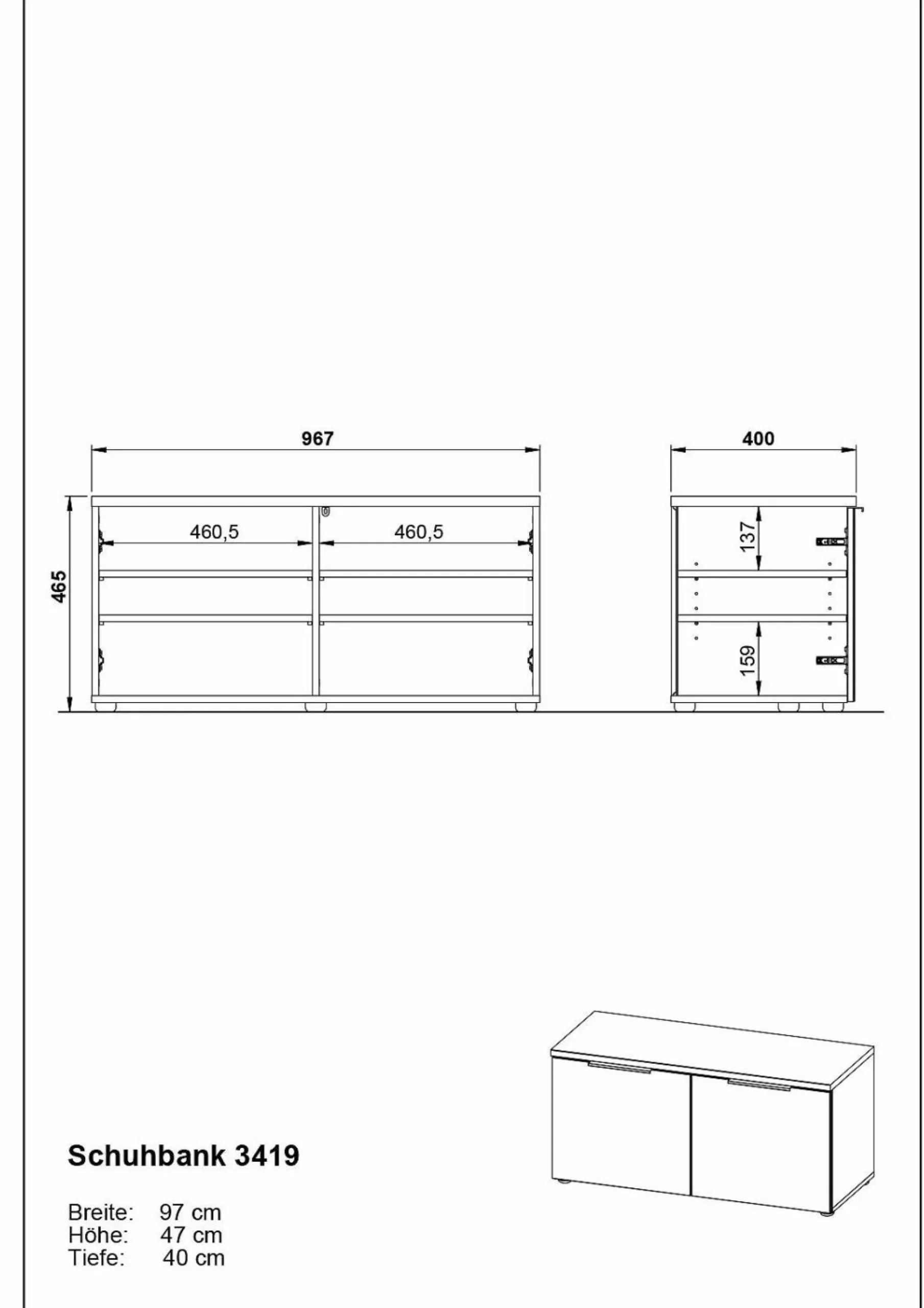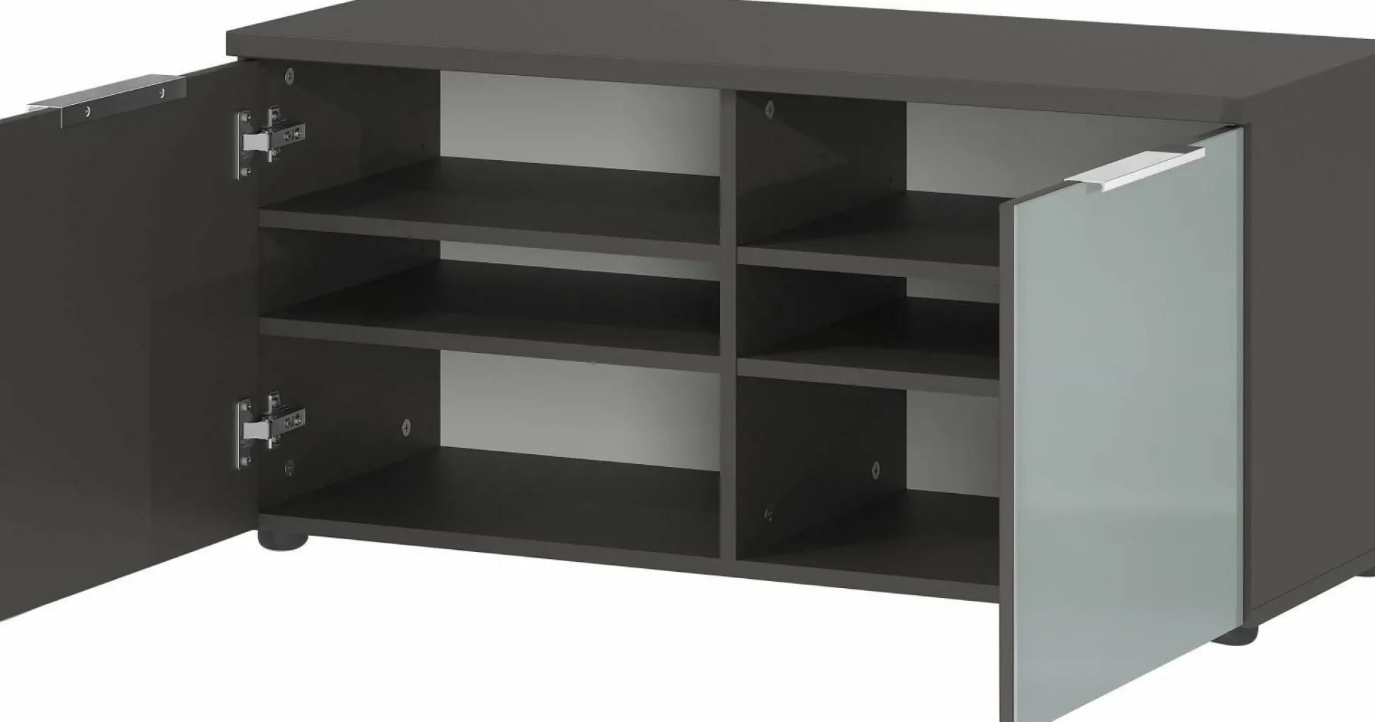 · Schuhbank mit zwei Türen, dahinter je zwei verstellbare Einlegeböden (jeweils belastbar bis zu 15 kg), Oberboden kurzzeitig belastbar bis zu 80 kg, Unterboden belastbar bis zu 20 kg, Korpus in Graphit, Glasfronten in Silbergrau, zwei Kantengriffe aus Metall in Chrom, fünf schwarze Möbelgleiter aus Kunststoff, passend dazu Sitzkissen 3439, Platz für bis zu 12 Paar Schuhe, Melaminharzbeschichtung, Türdämpfung, hochwertige ABS-Kanten, Made in Germany.