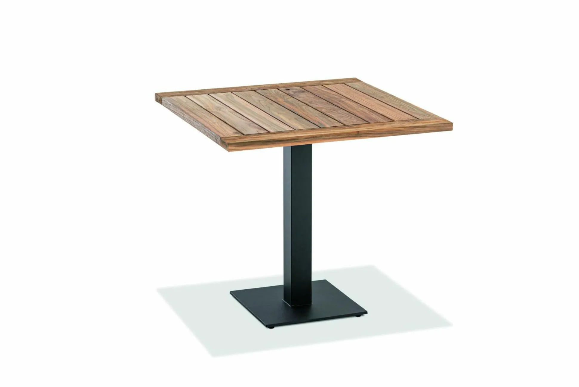 · Tisch BISTRO Tischplatte Teak recycelt, Gestell Profilsäule quadratisch Edelstahl pulverbeschichtet, Farbton anthrazit.