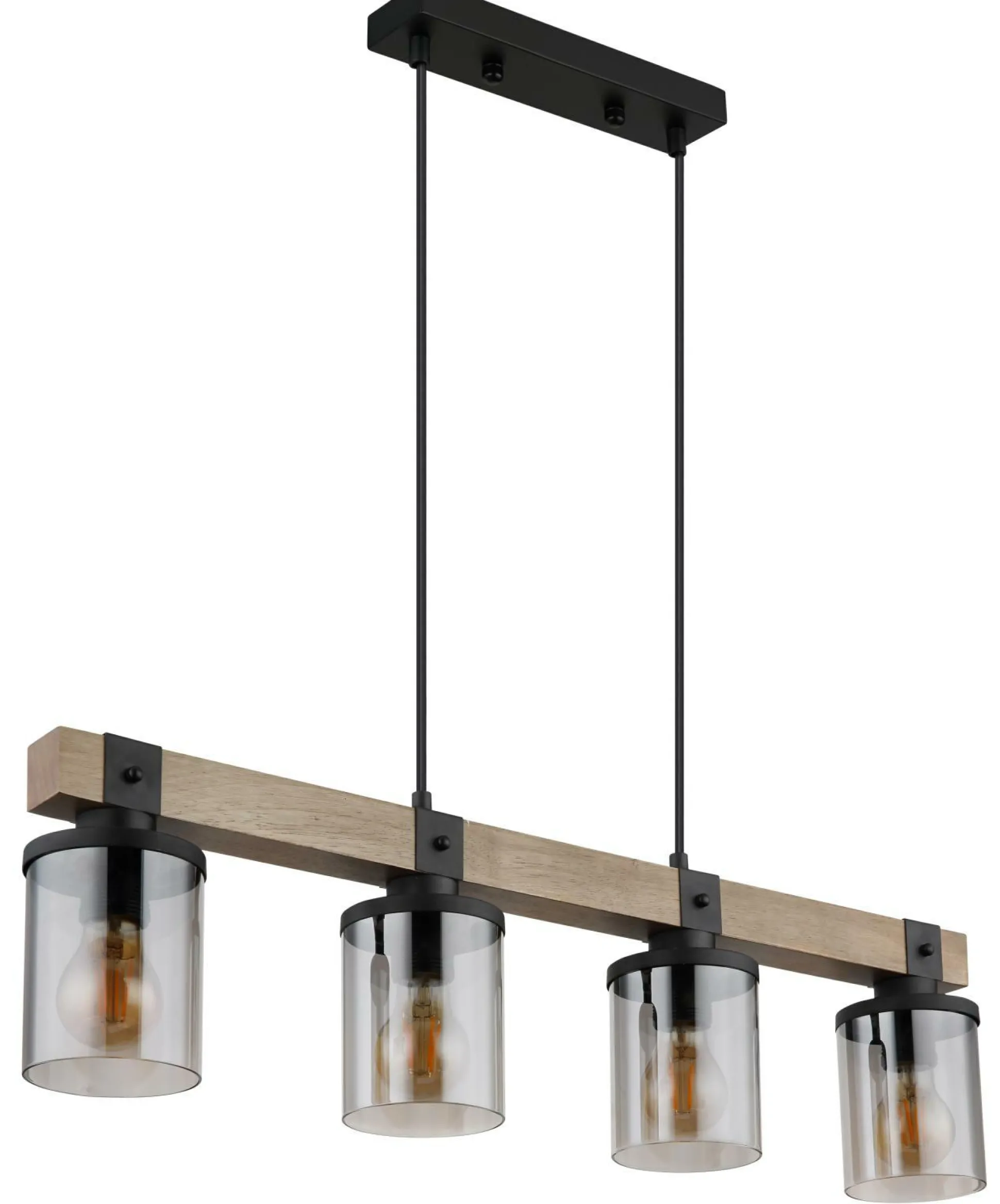 · Diese schöne Hängeleuchte begeistert durch tolles Design. Aus einer schmalen Deckenbefestigung verlaufen zwei schwarze Kabel zu einem 73cm langen Holzstamm. An dem Holzgerüst befinden sich 4 E27 Fassungen mit jeweils einem rauchfarbigen Schirm in Form eines Zylinders (Ø10cm).  Durch die freie Auswahl der Leuchtmittel können Sie, bis zu einer maximalen Leistung von 60 Watt, selbst über Lichtfarbe oder Helligkeit bestimmen. Setzen Sie neue Akzente in Ihren Räumlichkeiten.