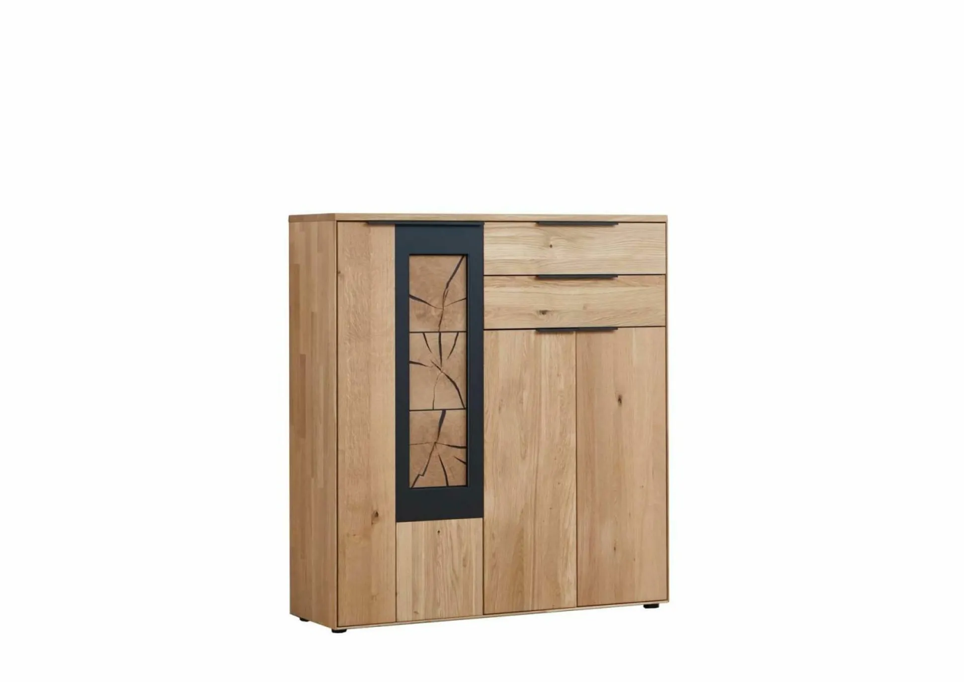 Front und Korpus: Wildeiche massiv soft gebürstet, Akzent Hirnholz, inkl. Gleiter mit 3 Türen und 2 Schüben, Türen und Schübe gedämpft, 3 Böden, 5 Fächer, Beleuchtung, Vollauszug, Schubkasten- einsatz und Trafo auf Wunsch, WM 1910