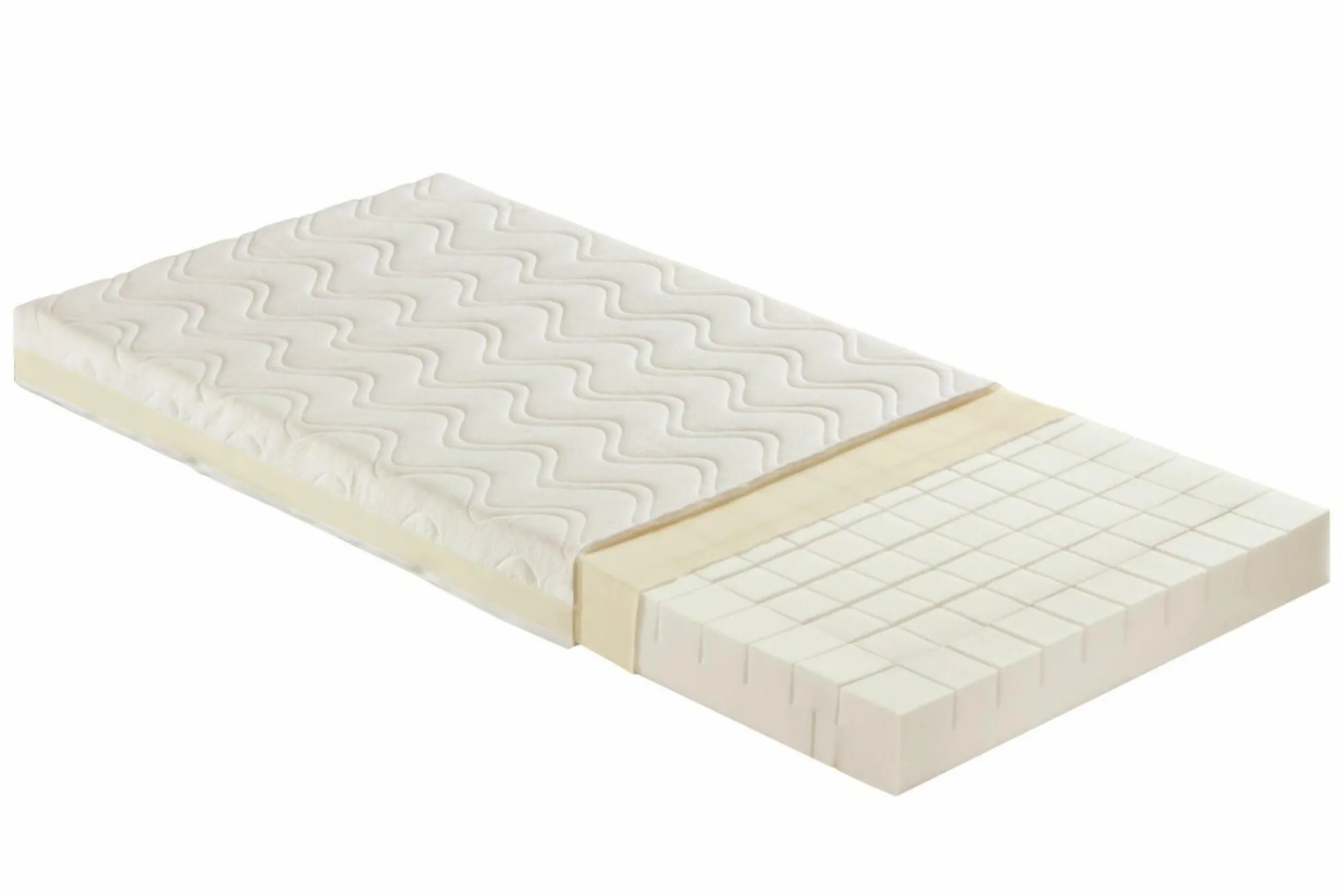 Kaltschaum, Baby- und Juniorseite durch unter- schiedliche Form und Tiefe der Ein- schnitte in den Oberflächen, Bezug: Doppeltuch mit seitlichem Klimaband, Höhe: ca. 10 cm, TKZ:60% Polyester, 40% Baumwolle