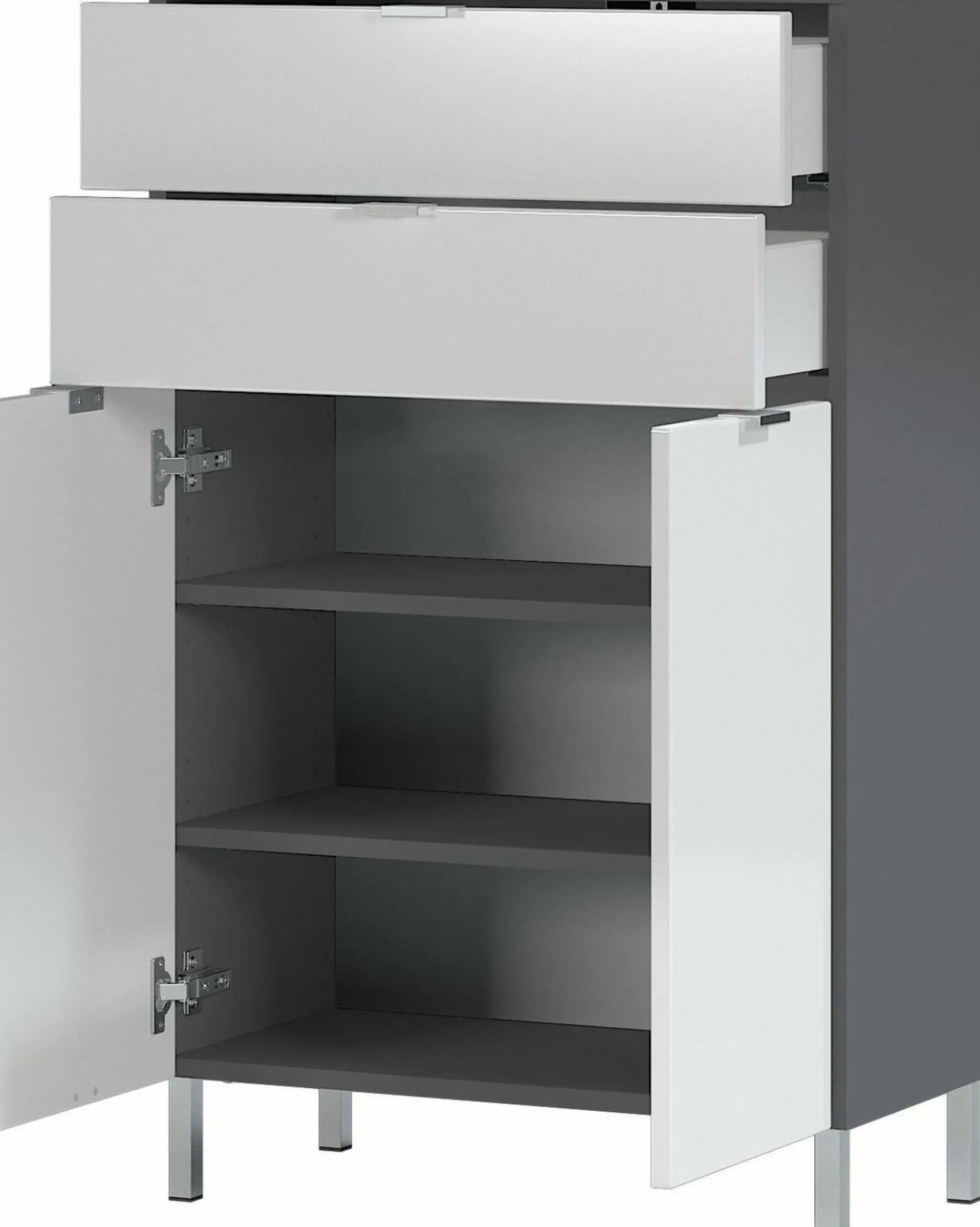 · Kommode mit zwei Schubladen (belastbar bis zu 10 kg) und zwei Türen – dahinter zwei verstellbare Einlegeböden (belastbar bis zu 10 kg), Oberboden belastbar bis zu 10 kg, Korpus in Graphit, Fronten in Weiß, vier Kantengriffe und vier Füße aus Metall in der Farbe Chrom, Melaminharzbeschichtung, hochwertige ABS-Kanten, Fronten MDF-tiefgezogen und hochglänzend, Türdämpfung, Selbsteinzug der Schubladen, Made in Germany
