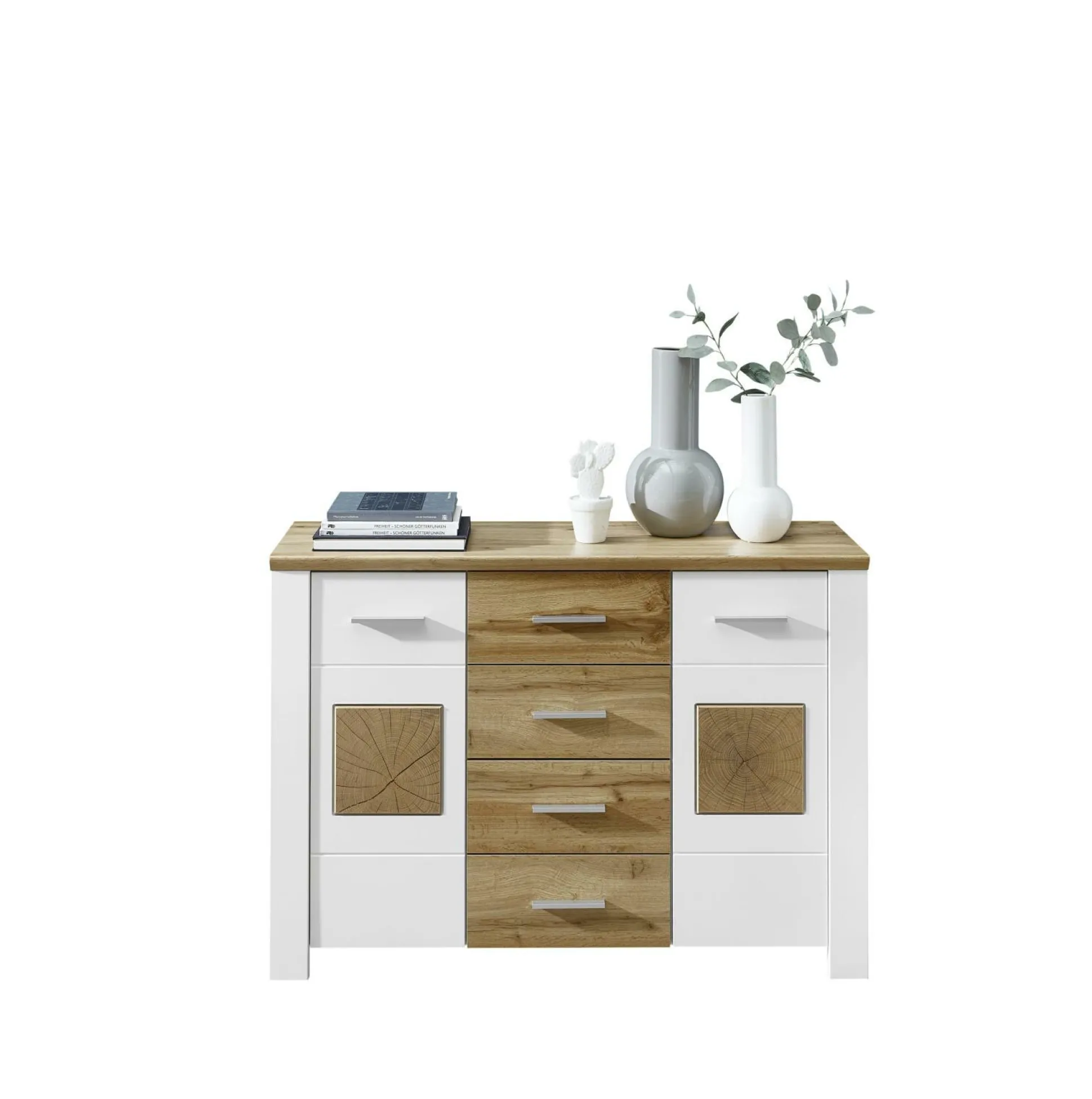 Werten Sie Ihren Wohnraum mit der Kommode Materio aus dem Hause vito auf. Das wohnliche Design ist ein echter Hingucker und wird Freunde und Familie staunen lassen. Die Front ist aus Lack Laminat weiß in supermatt gefertigt und wird von einem mattweißen Korpus vervollständigt. Die Absetzungen aus Hirnholz Nachbildung und Eiche Altholz Nachbildung sorgen für ein echtes Highlight. Die Kunststoffgriffe in Chrom matt runden das Design perfekt ab. Die Anrichte kommt mit zwei Türen mit Softclose und 4 Einlegeböden und vier Schubkästen, ebenfalls mit Softclose und Selbsteinzug.
