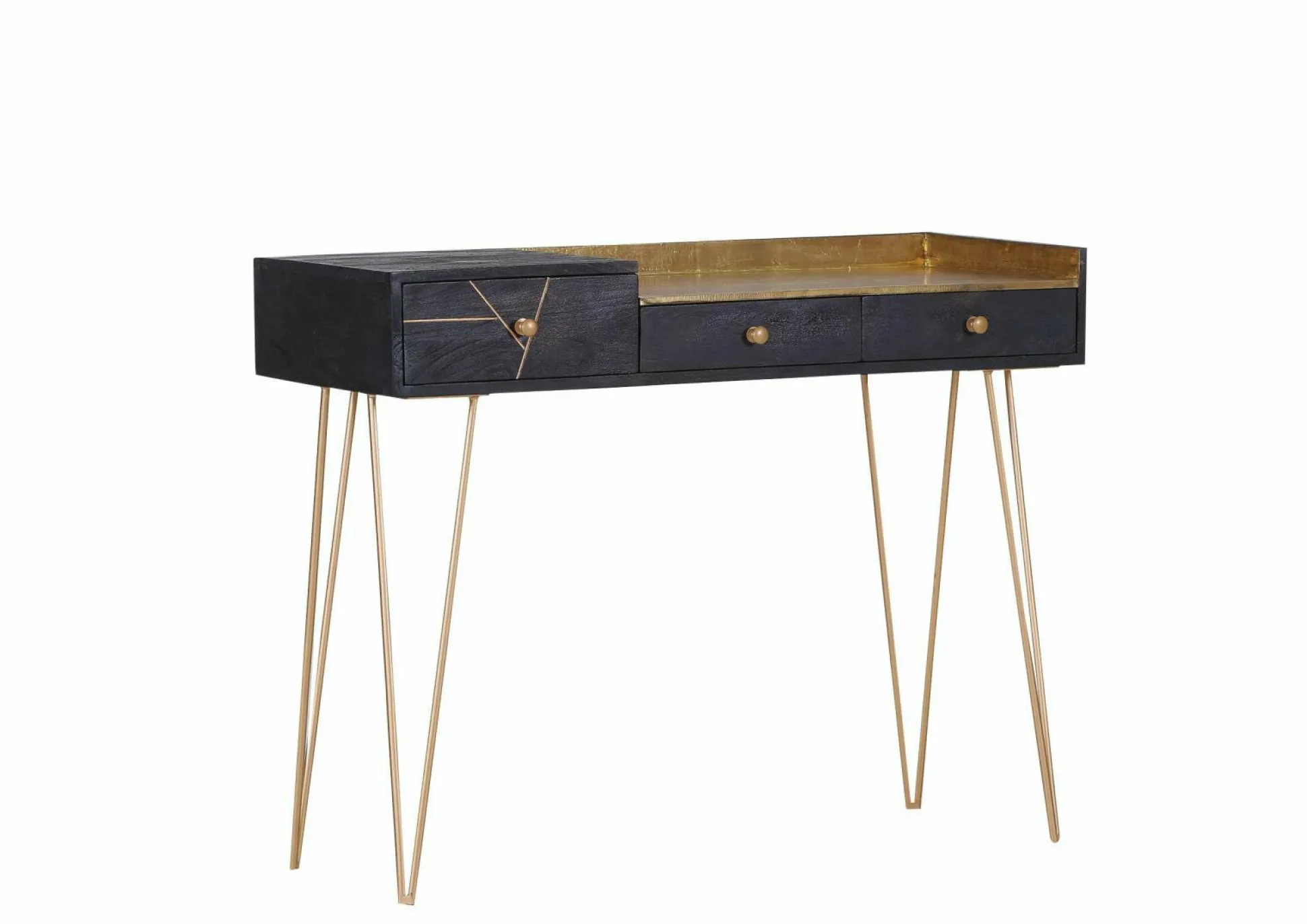 Die Konsole SCAN wird Ihr Zuhause perfekt aufwerten. Das moderne Design ist ein absoluter Hingucker und wird Familie und Freunde staunen lassen. Der Korpus ist aus massiver, sandgestrahlter Akazie gefertigt. Das Element ist dabei schwarz gebeizt und lackiert. Die Arbeitsplatte ist mit Messing verziert. Das pulverbeschichtete, goldfarbige Metallgestell sorgt für einen schicken Kontrast, der das Design perfekt abrundet.
