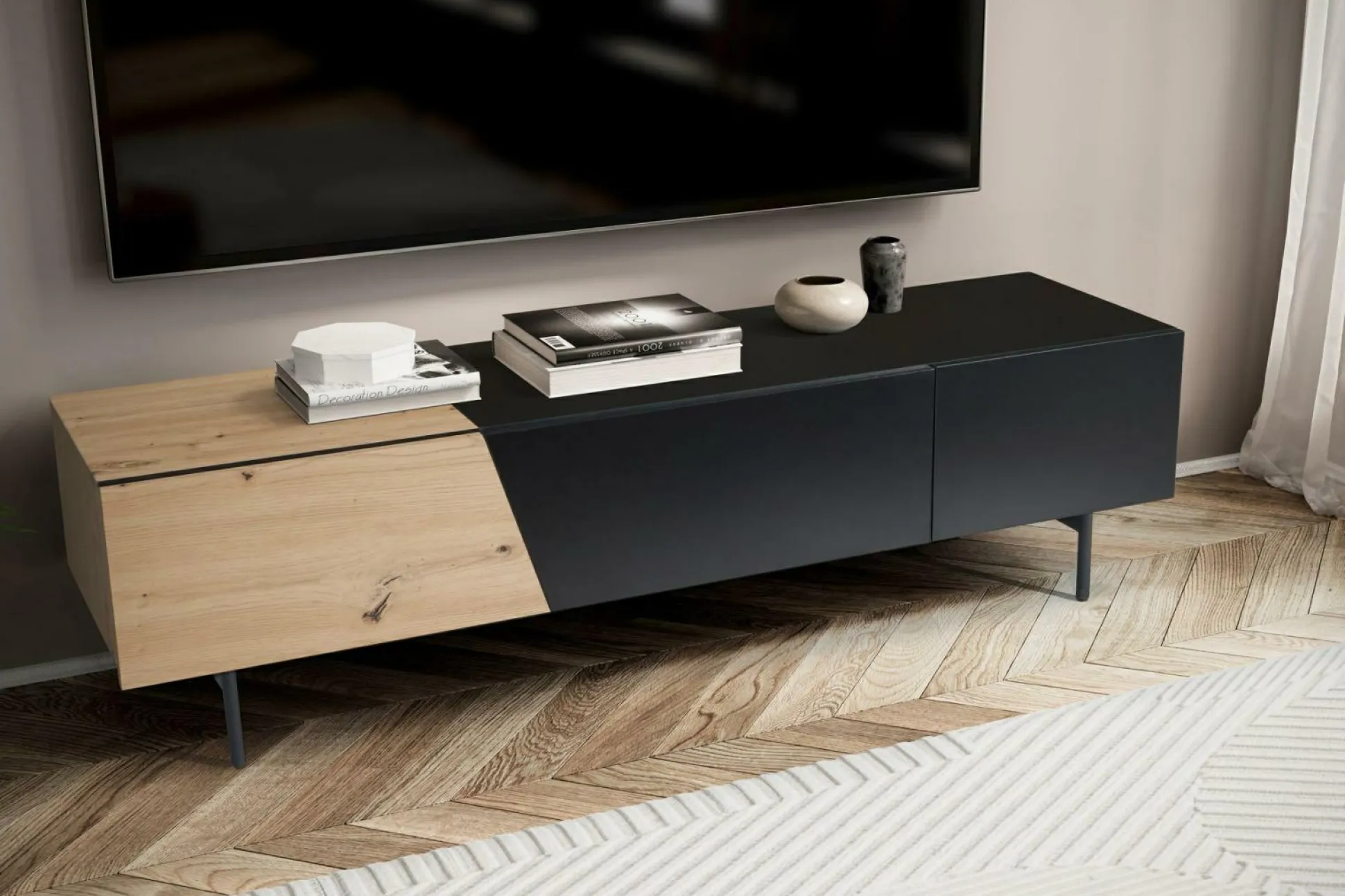 · Lieferumfang – Ein Fernsehunterschrank ohne Dekoration. Lieferzustand: demontiert und sicher verpackt. Montagematerial und -anleitung liegen der Lieferung bei.