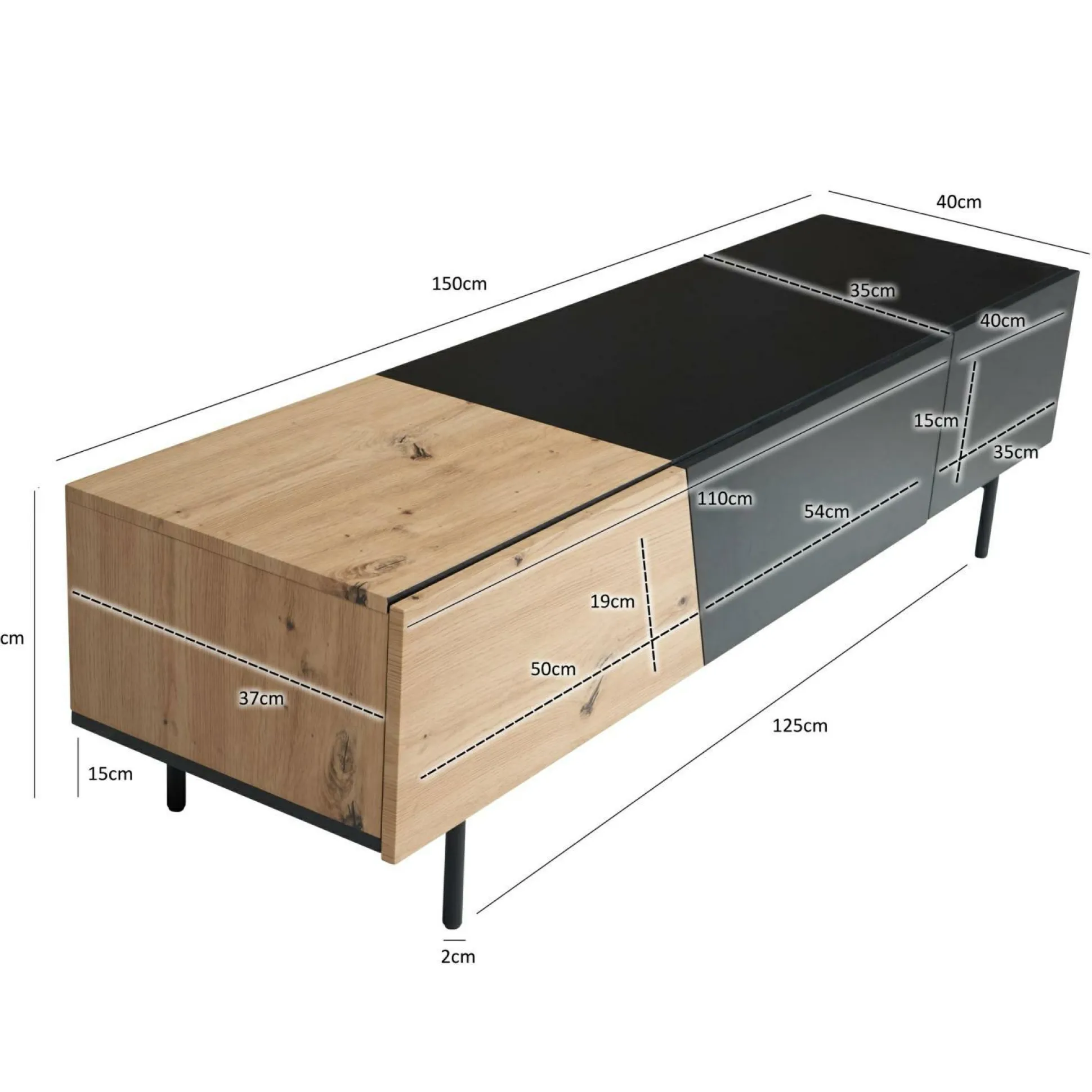 · Abmessungen – Breite: 150 cm // Höhe: 40 cm // Tiefe: 40 cm // Innenmaße linkes Türfach (BxHxT): 50 x 19 x 37 cm // Innenmaße rechtes Türfach (BxHxT): 54 x 19 x 37 cm.