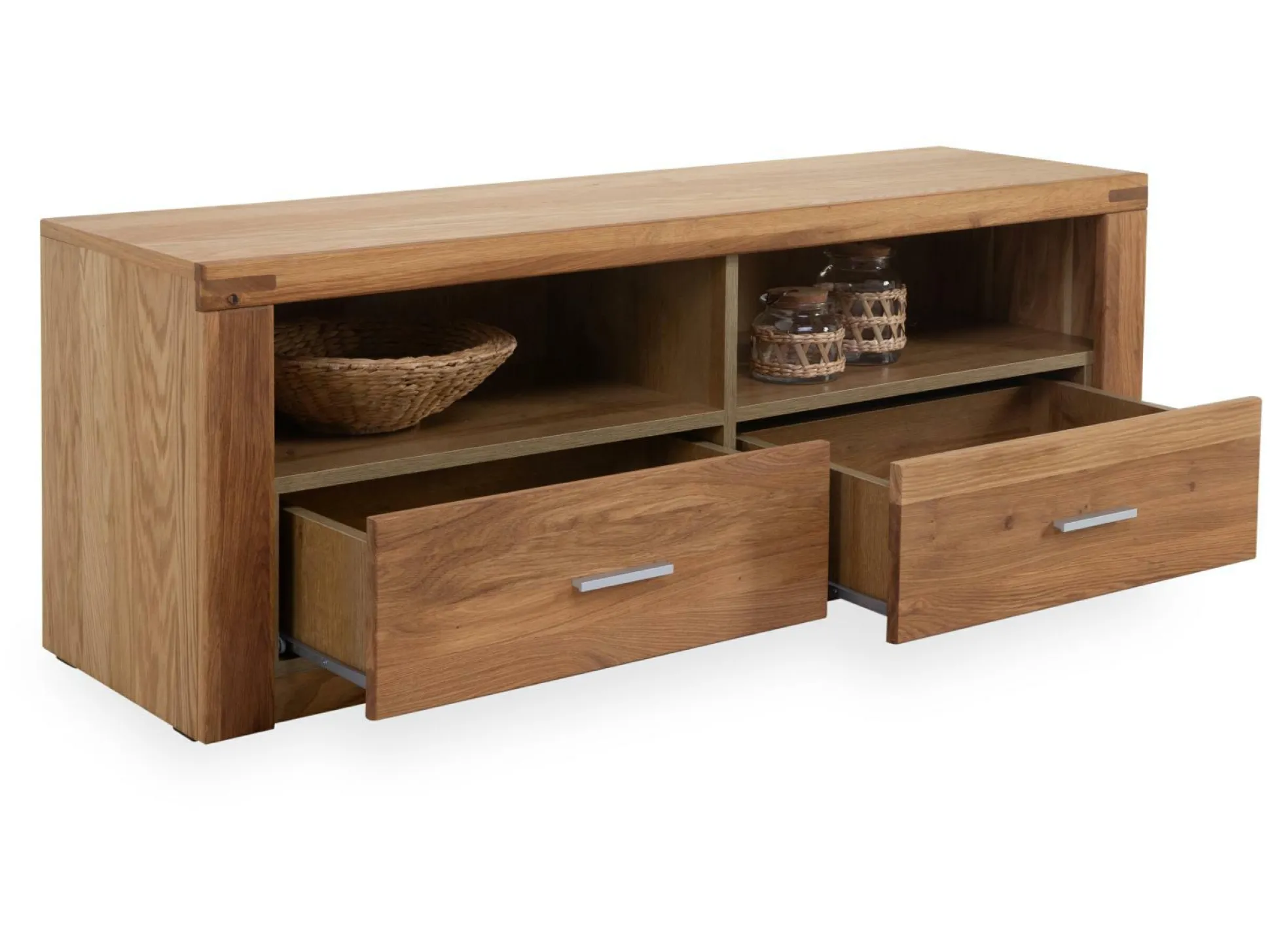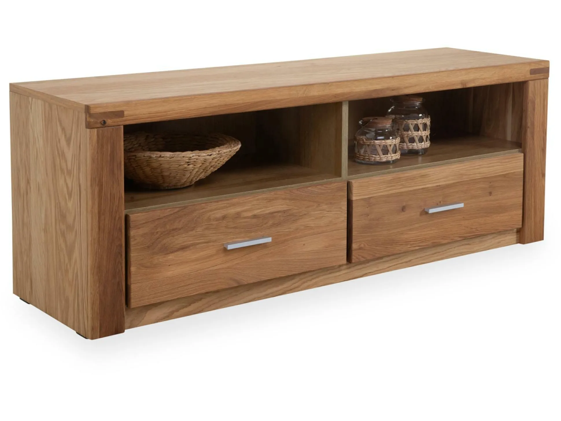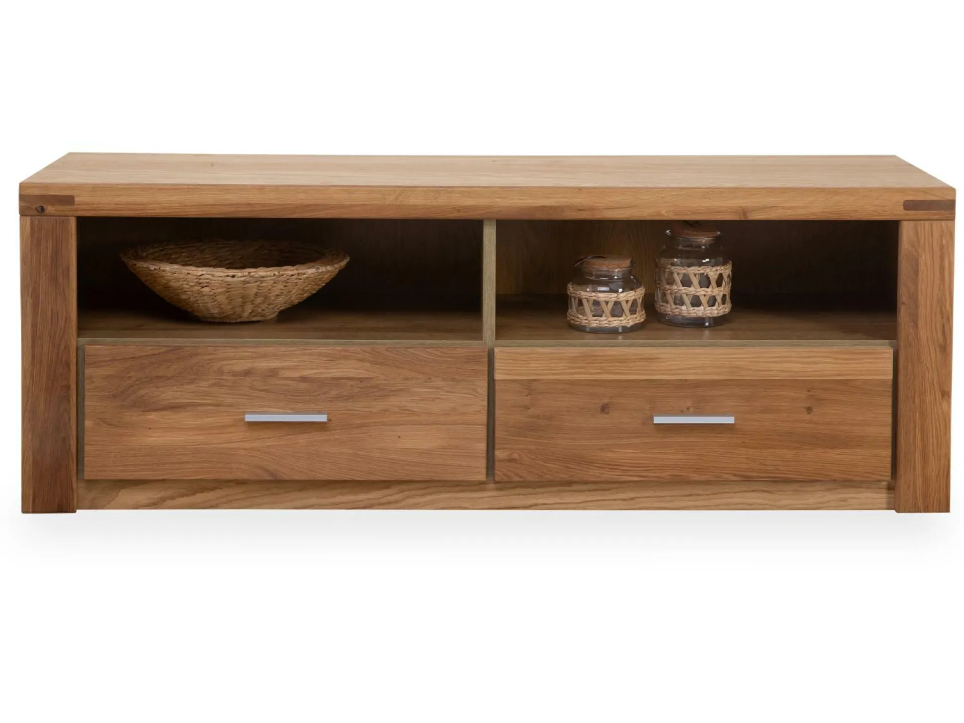 Das Lowboard Ela setzt natürliche Akzente in Ihrem Wohnbereich. Ausgestattet mit zwei Schubkästen und zwei offenen Fächern bietet das TV-Unterteil ausreichend Platz, um technische Geräte und Zubehör darin zu verstauen. Mit einer Front aus massiver, geölter Wildeiche, einem Korpus aus Wildeiche-Nachbildung, sowie einer Oberplatte aus Massivholz, entsteht ein robustes Element, das in verschiedensten Stilen zu überzeugen weiß. Attraktive Griffe an den Schubkästen erleichtern zudem das Öffnen und Schließen.