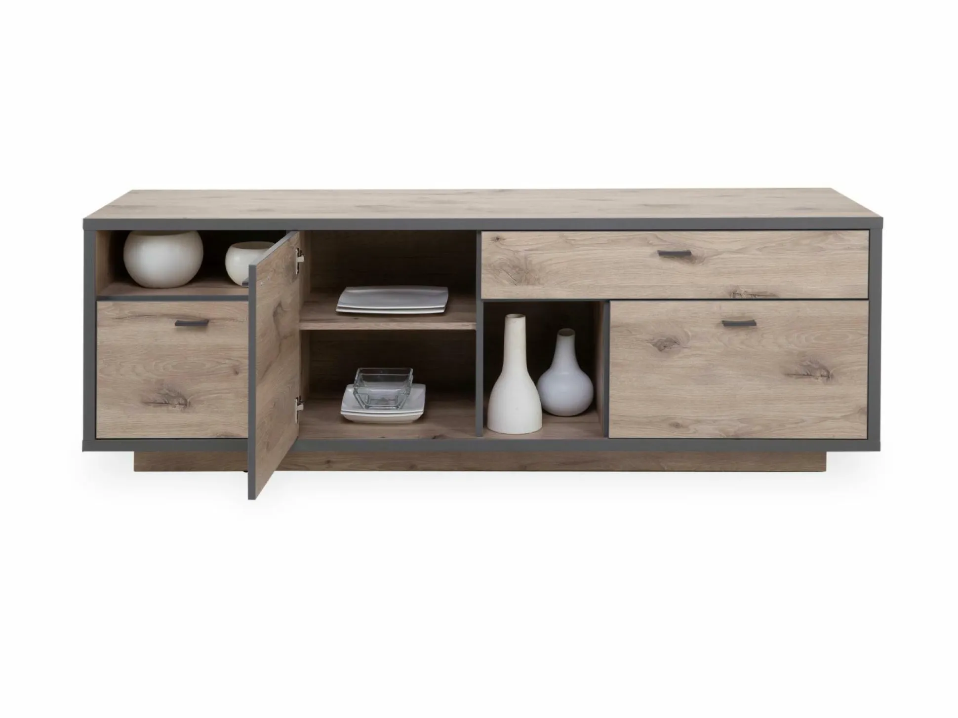 · mit einer Holztür, drei Schub- kästen und zwei offenen Fächern