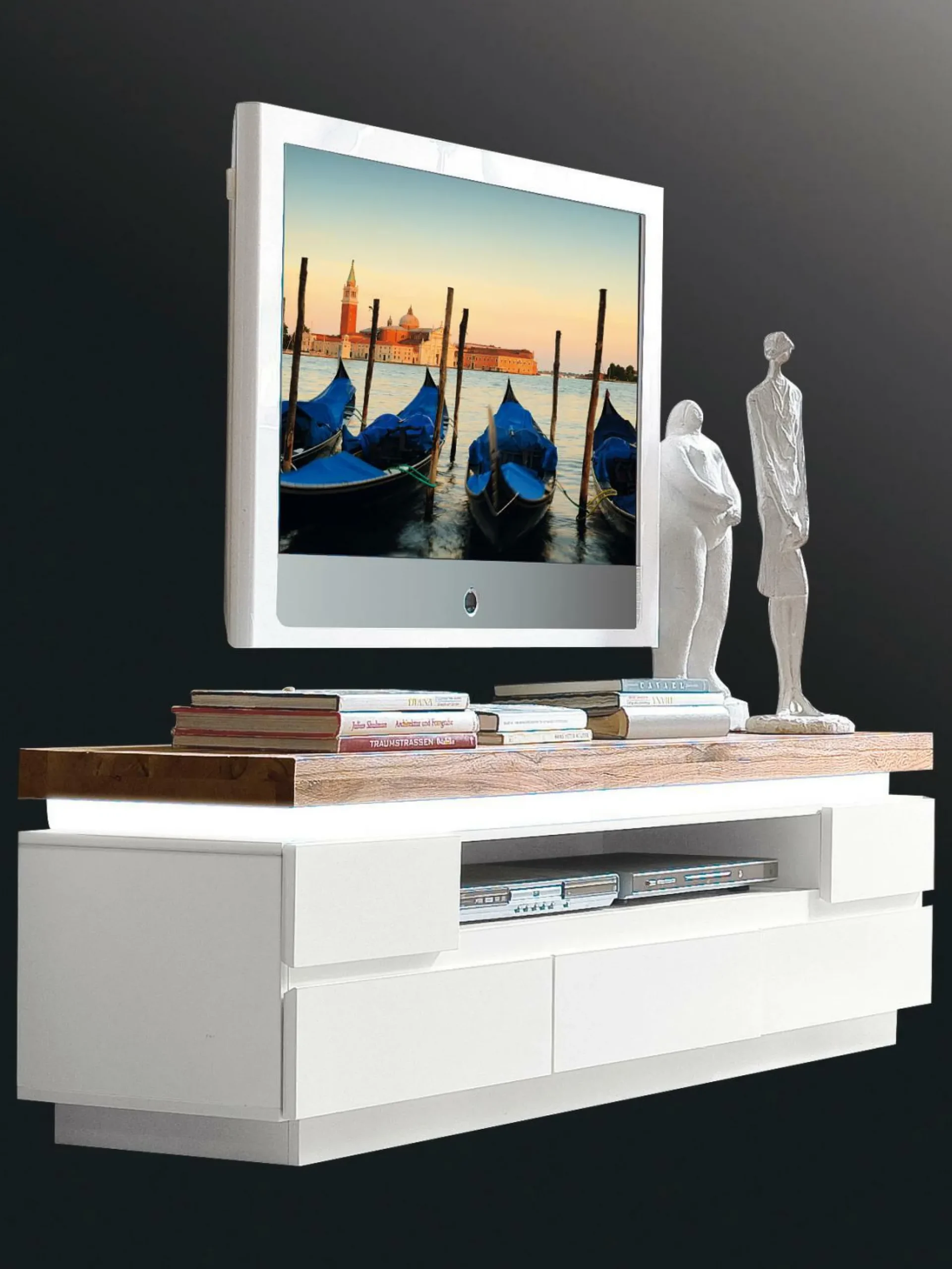Das Lowboard Murio ist die moderne und attraktive Lösung, um Ihre Hi-Fi-Geräte ordnungsgemäß unterzubringen. Den perfekten Kontrast zum gradlinigen Design in mattem Weiß stellte die massive Deckplatte aus Asteiche her. Ausgestattet mit fünf Schubkästen und einem offenen Fach bietet Murio ausreichend Platz sowohl für Elektrogeräte als auch für das passende Zubehör. Für eine dezente Beleuchtung an lange Fimabenden sorgt die dimmbare Beleuchtung unterhalb des Kranzes samt passender Fernbedienung.