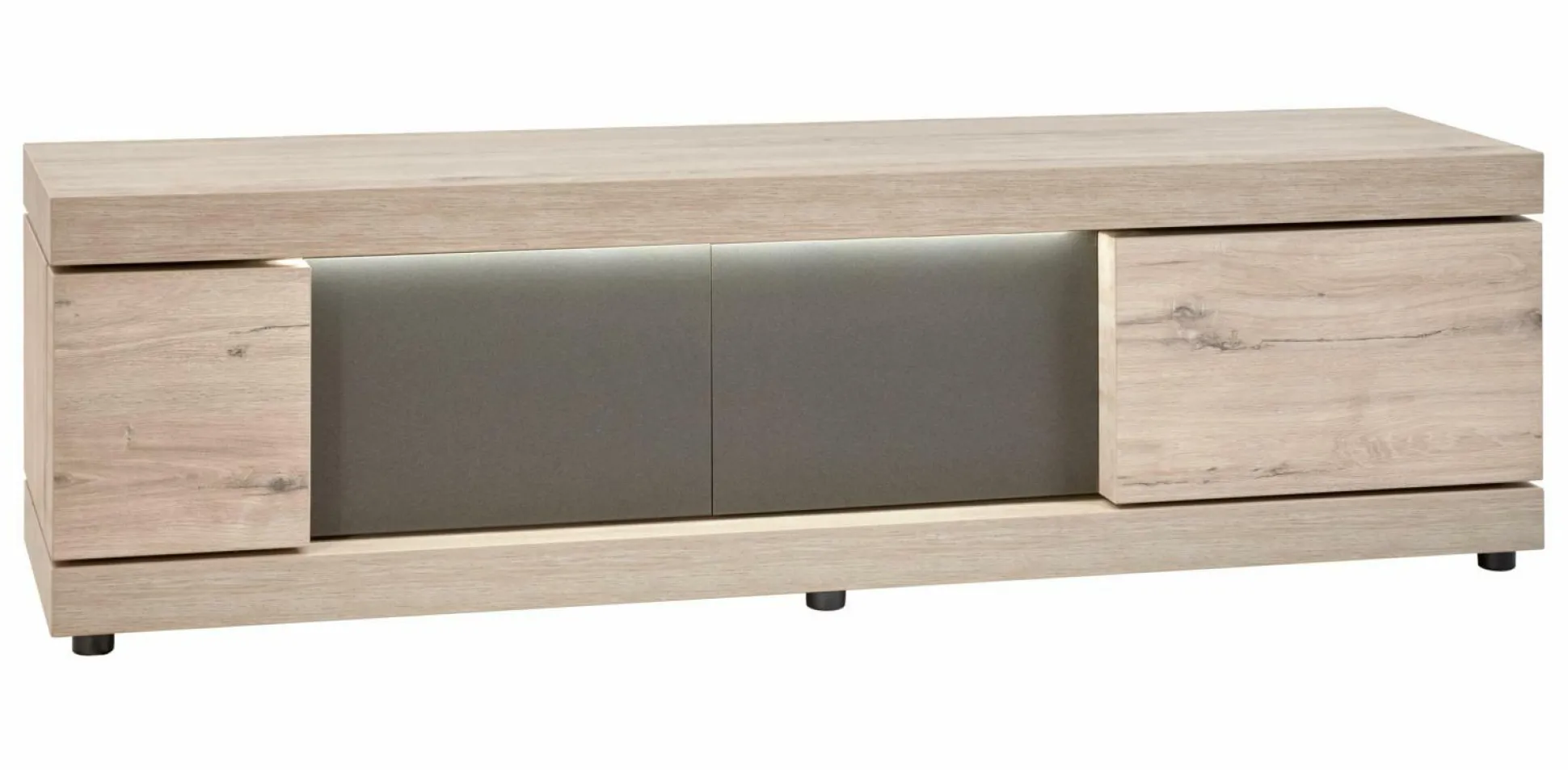 Lowboard Conduct von vito begeistert mit einem geschmackvollen Look in Ihrem Wohnbereich. Das kantige Möbelstück wurde aus hellgrauer Millenium Eiche Nachbildung gefertigt und wird von Absetzungen in dunkelgrauer Nachbildung ergänzt. Ausreichend Stauraummöglichkeiten für technische Geräte und Zubehör bietet das Lowboard hinter vier Türen. Das Lowboard ist zudem mit Beleuchtung ausgestattet, so schafft es außergewöhnliche Akzente im Wohnbereich.