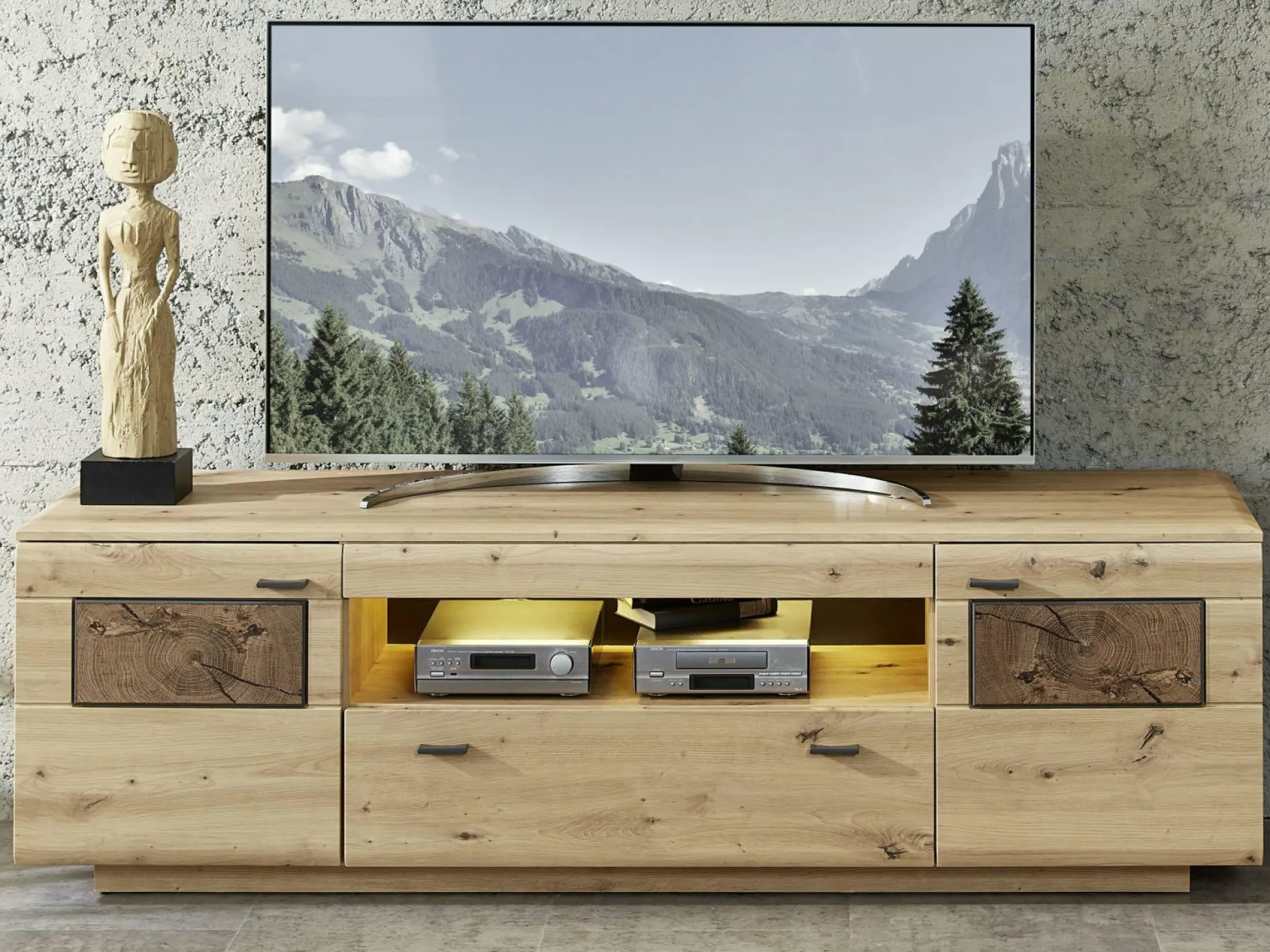 Mit dem Lowboard Lavado aus dem Hause vito verbinden Sie Stilbewusstsein mit Ordnung und Platz. Das wohnliche Design ergänzt nahezu jedes Wohnkonzept und schafft dabei ein kleines Highlight in Ihrem Wohnbereich. Sowohl der Korpus als auch die Front sind aus Artisan Eiche Nachbildungen gefertigt. Die Front wird dabei durch Absetzungen aus Hirnholz vervollständigt. Die Griffe aus graphitfarbigem Metall runden den Gesamtlook perfekt ab. Damit Sie das Zubehör für Ihren Fernseher kinderleicht verstauen können, ist die Kommode mit zwei Holztüren, einer Schublade und einem offenen Fach ausgestattet. Damit Sie Ihr liebstes Hab und Gut gekonnt in Szene setzen können, ist auf Wunsch Beleuchtung erhältlich.