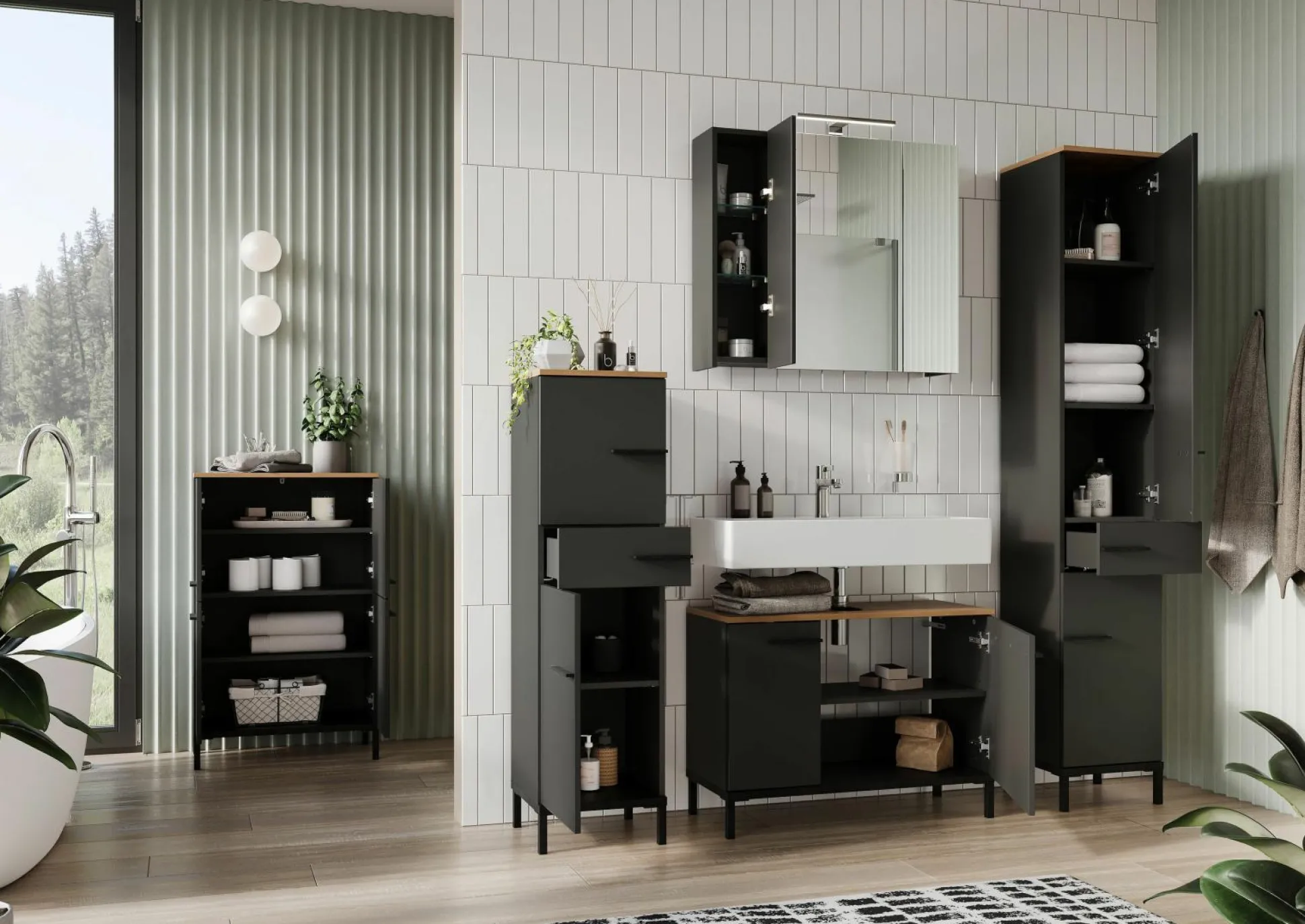 · Schrank mit einer Schublade (belastbar bis zu 10 kg) und zwei Türen – dahinter je ein verstellbarer Einlegeboden (belastbar bis zu 10 kg), Unterboden in Schwarz (belastbar bis zu 15 kg), Oberboden in Navarra-Eiche-Nb. (belastbar bis zu 10 kg), Rest in Graphit, drei Steggriffe und vier hohe Füße aus Metall in Schwarz, Melaminharzbeschichtung, hochwertige ABS-Kanten, Türen rechts/links anschlagbar, Türdämpfung, Selbsteinzug der Schublade, Made in Germany.