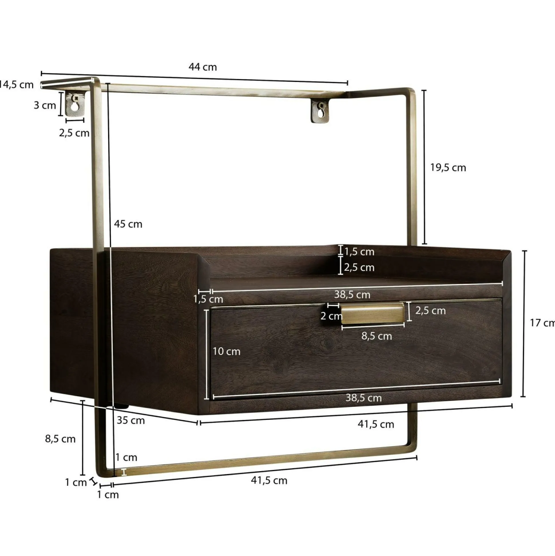 · Abmessungen – Breite: 44 cm // Höhe: 45 cm // Tiefe: 35 cm // Innenmaße Schublade (BxHxT): 38,5 x 10 x 30,5 cm // Obere Ablagefläche (BxT): 38,5 x 25 x 33,5 cm.