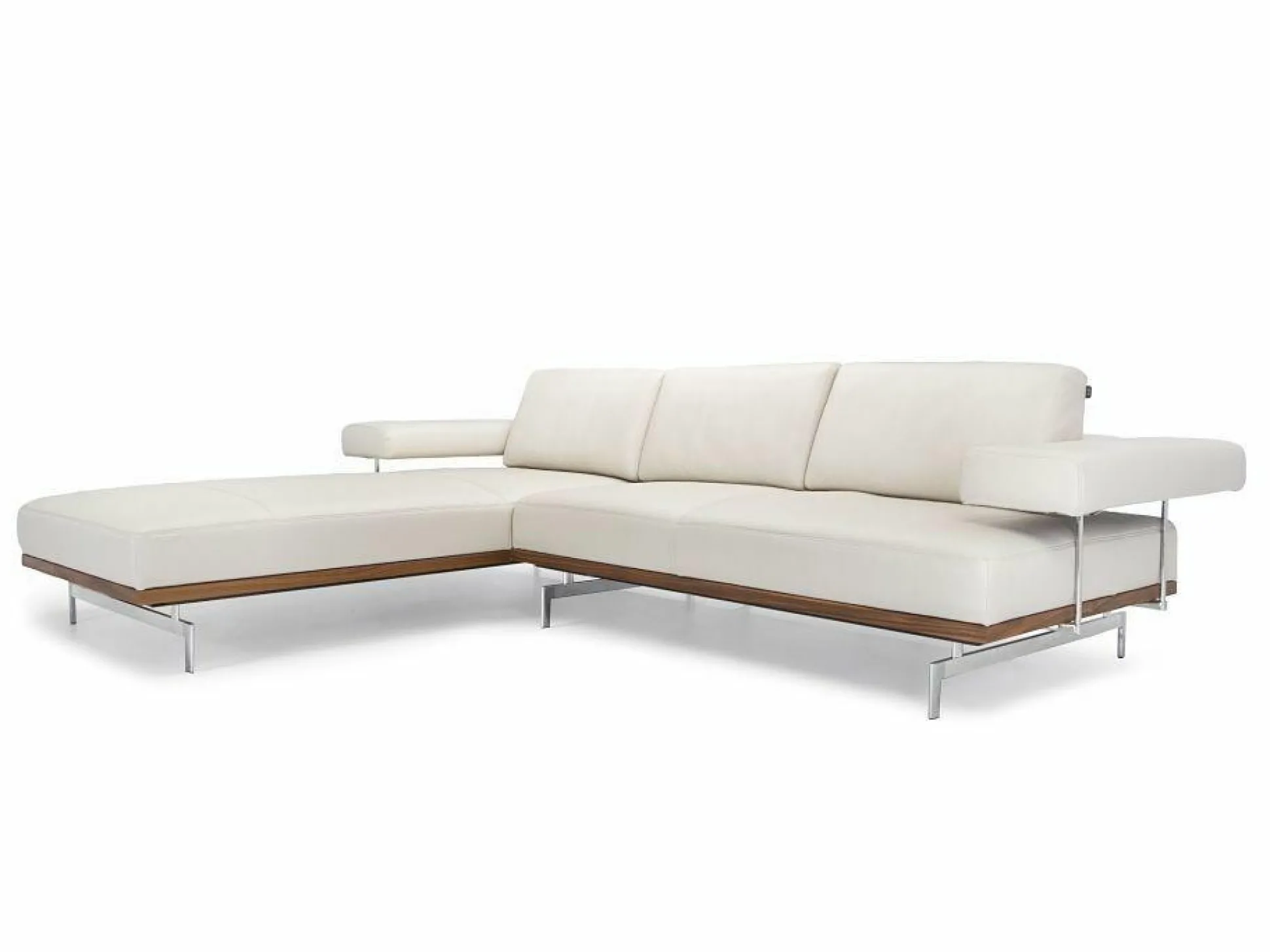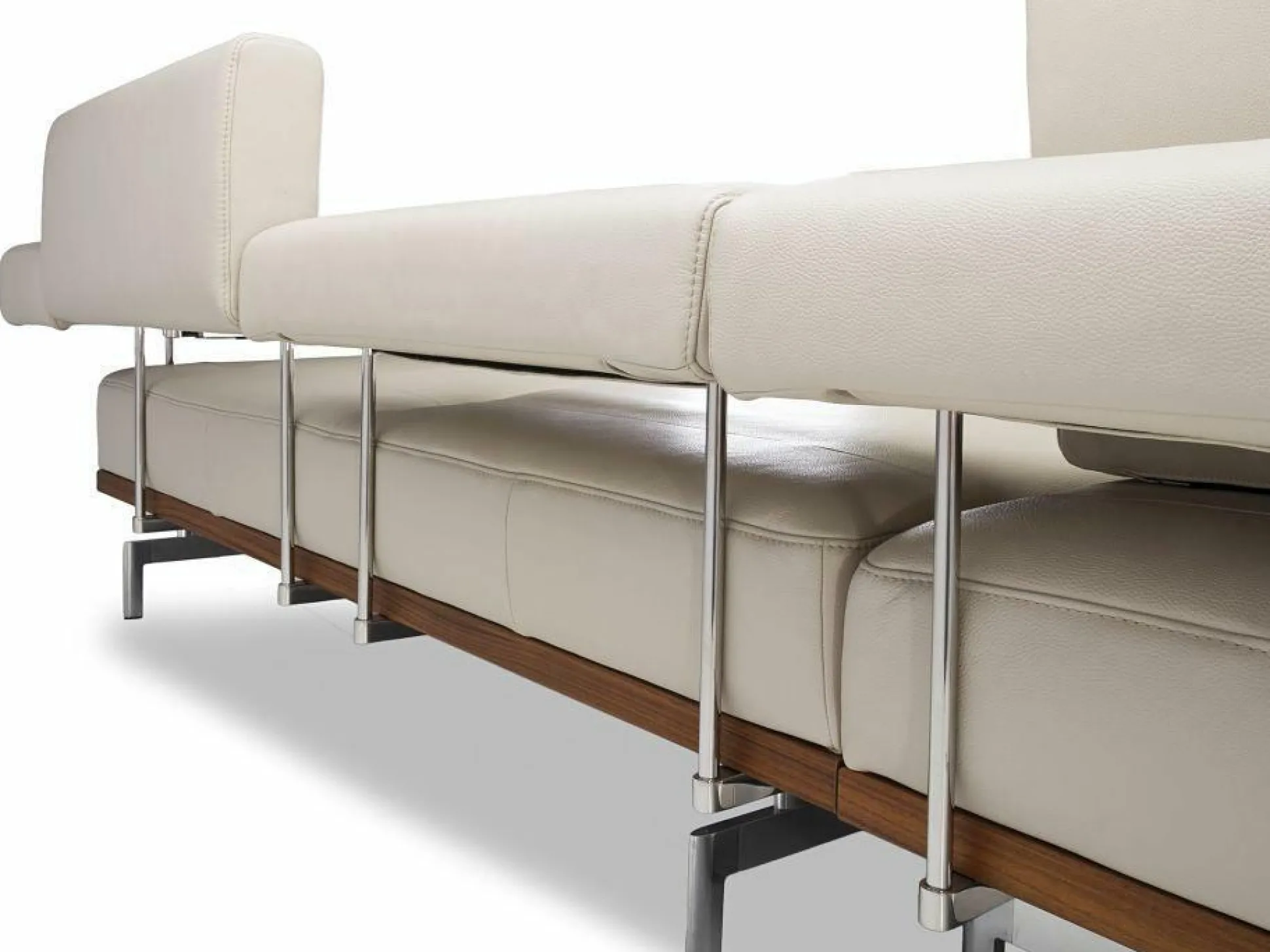 Das stilvolle Ecksofa mit hellem Echt Leder Bezug entspricht einem modernen Stil, der durch Nussbaum Holz ergänzt wird. Die Kufe aus hochglänzend poliertem Aluminium ergänzt das schicke Design. Die optisch ansprechende Polsterecke ist auch am Rücken echt bezogen. Somit ist die Positionierung im Raum möglich.