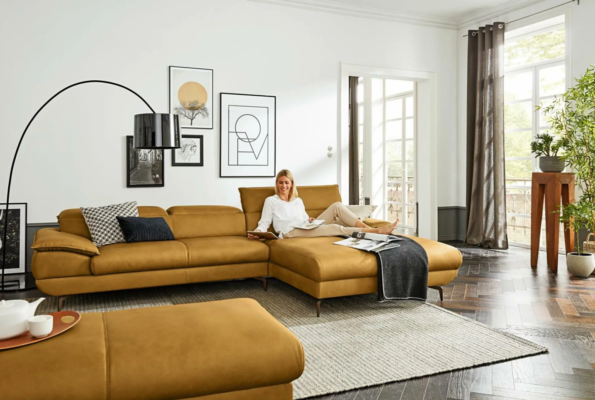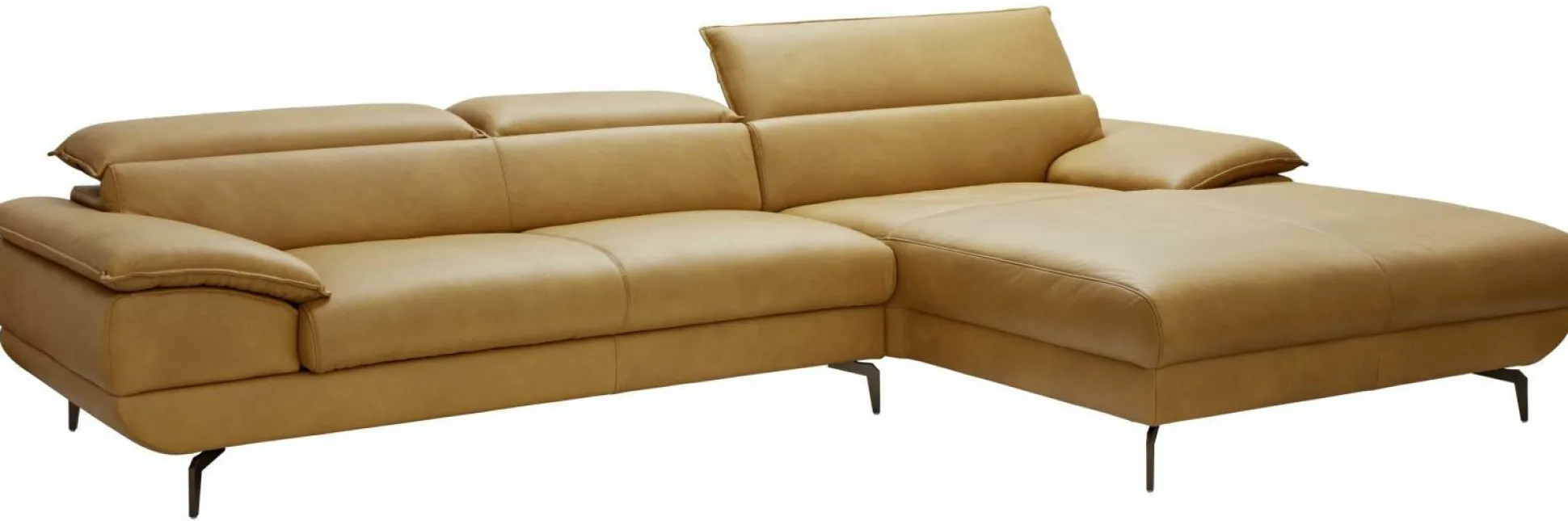 Erfahren Sie Geborgenheit und Erholung mit Ihrer neuen Polsterecke Hoya aus dem Hause MONDO. Die schicke Polsterecke ist aus Kurkumafarbenden Echtleder gefertigt und besteht aus einem gemütlichen zweisitzigen Sofa, sowie einem Longchair. Somit finden nicht nur Sie, sondern auch Ihre Liebsten Platz für gemeinsame Abende. Die Polsterung aus PUR-Schaum auf Wellenfedern sorgt für einen hohen Sitzkomfort. Abgerundet wird das Design der Polsterecke von bronzefarbenen Metallfüßen. Der Rücken der Polsterecke ist echt bezogen. Im Lieferumfang sind keine Kopfteilverstellung und Sitzauszug enthalten.