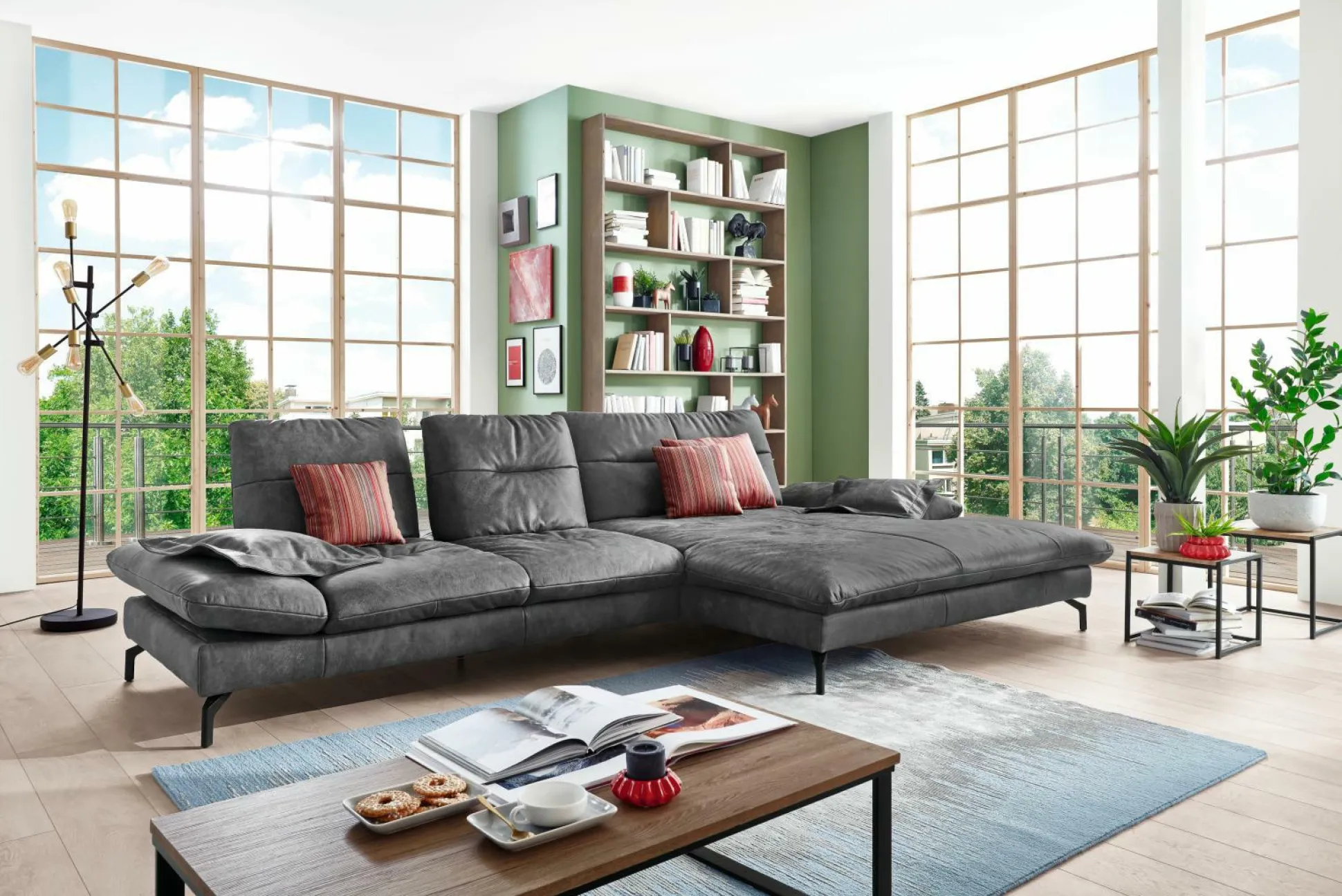 Lehnen Sie sich entspannt zurück auf der Polsterecke Pacific. Die Sofalandschaft ist mit einem edlen Echtlederbezug in Schwarz versehen und sorgt damit für eine hochwertige Optik. Neben einer attraktiven Gestaltung bietet das Sofa, bestehend aus einem 2,5-Sitzer und einem Longchair, durch drei Schwenkrücken sowie eine bequeme PUR-Schaumpolsterung auf Wellenfedern besten Sitzkomfort, der zum Verweilen einlädt. Mattschwarze Füße runden den edlen Look ab und sorgen für ausreichend Stabilität.