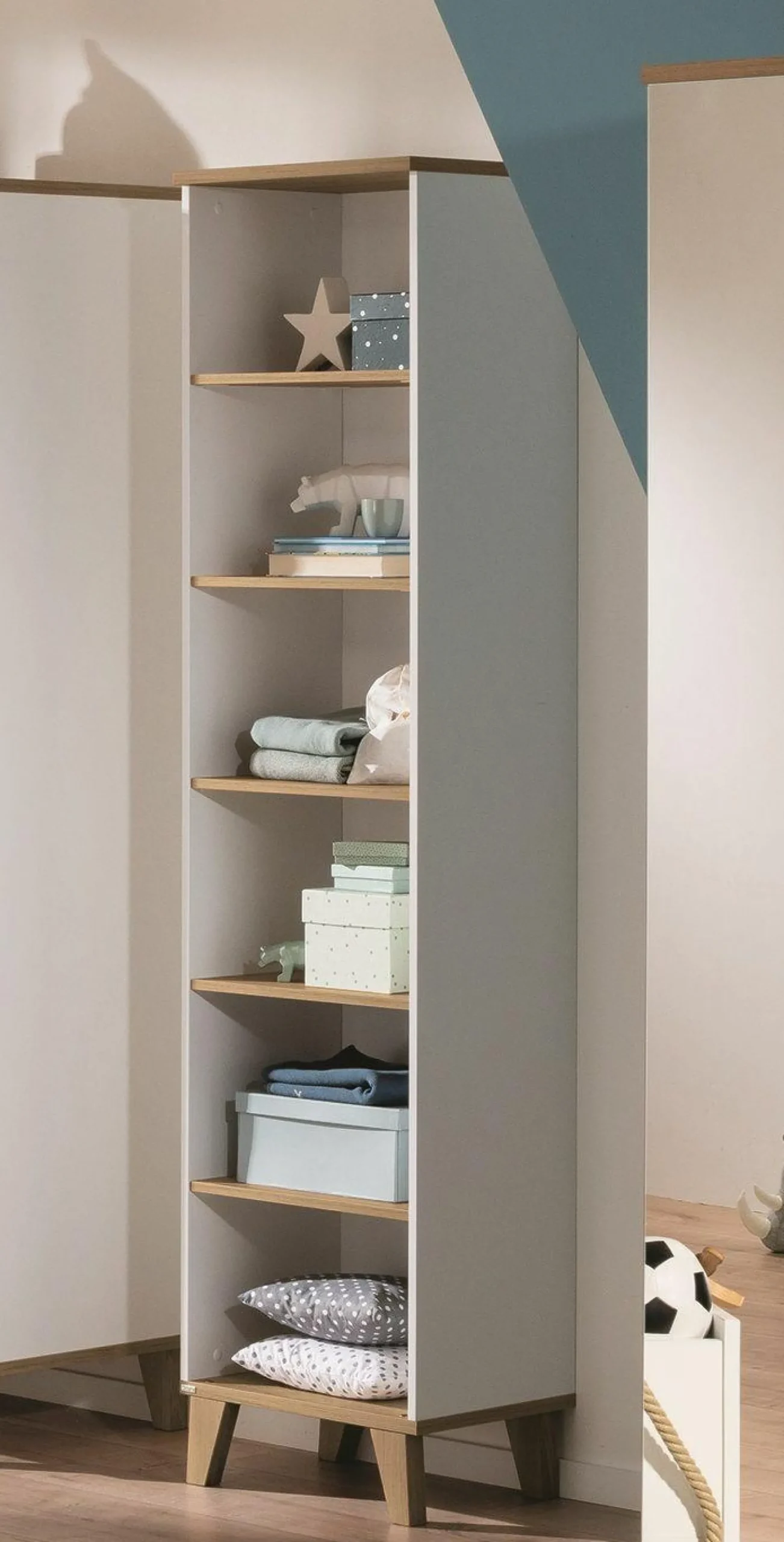 Ergänzen Sie Ihren Wohnraum durch das Regal Oscar der Marke PAIDI. Dieses kreideweiße, dezente Regal verfügt über sechs offene Fächer in denen Sie verschiedenste Gegenstände platzieren können. Die Regalböden bestehen aus einer Eichenholz Nebraska Nachbildung und schaffen einen ansprechenden Kontrast zum hellen Korpus des Regals. Die Füße bestehen aus massivem Eichenholz und verleihen dem schmalen Regal einen guten Stand.