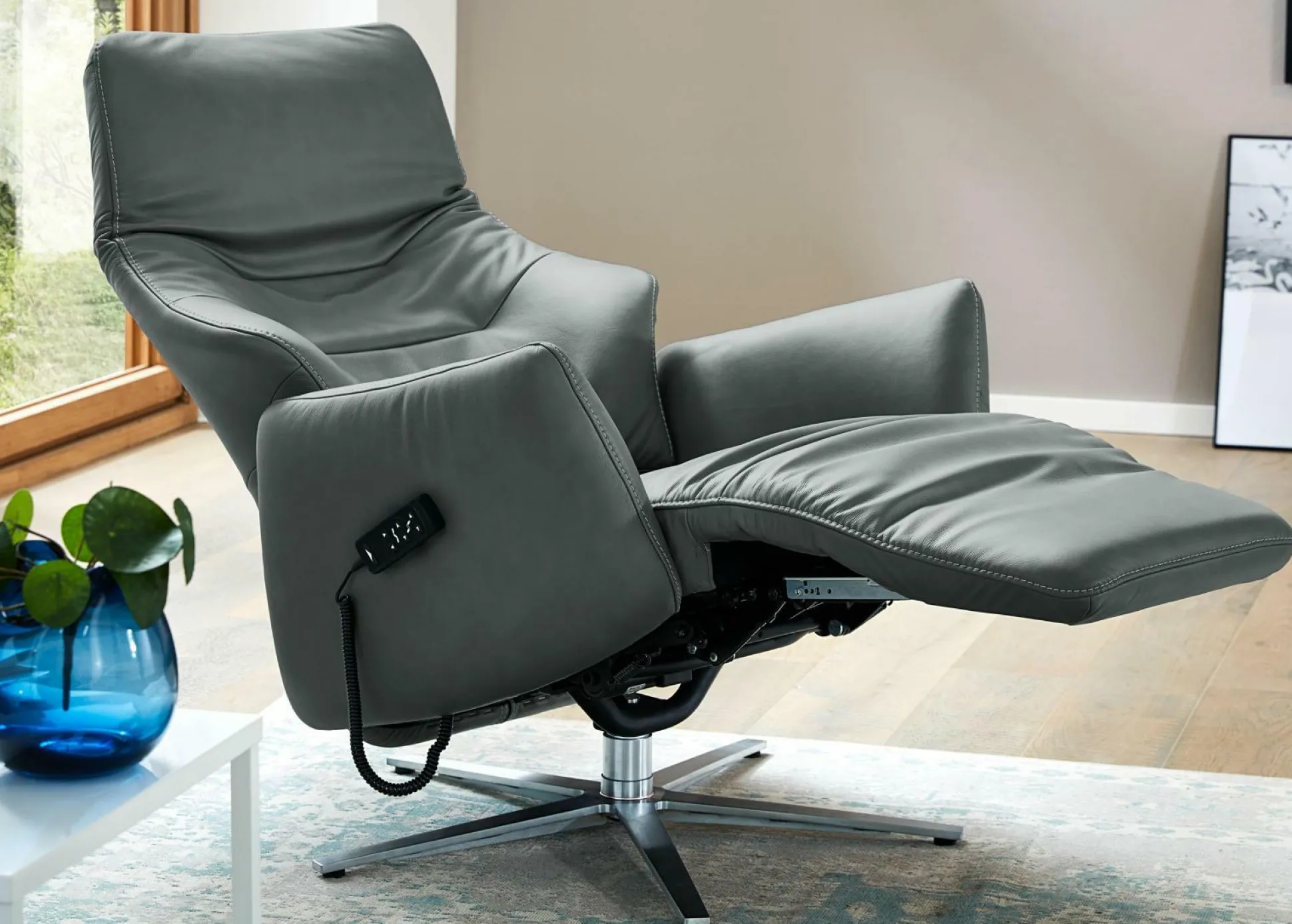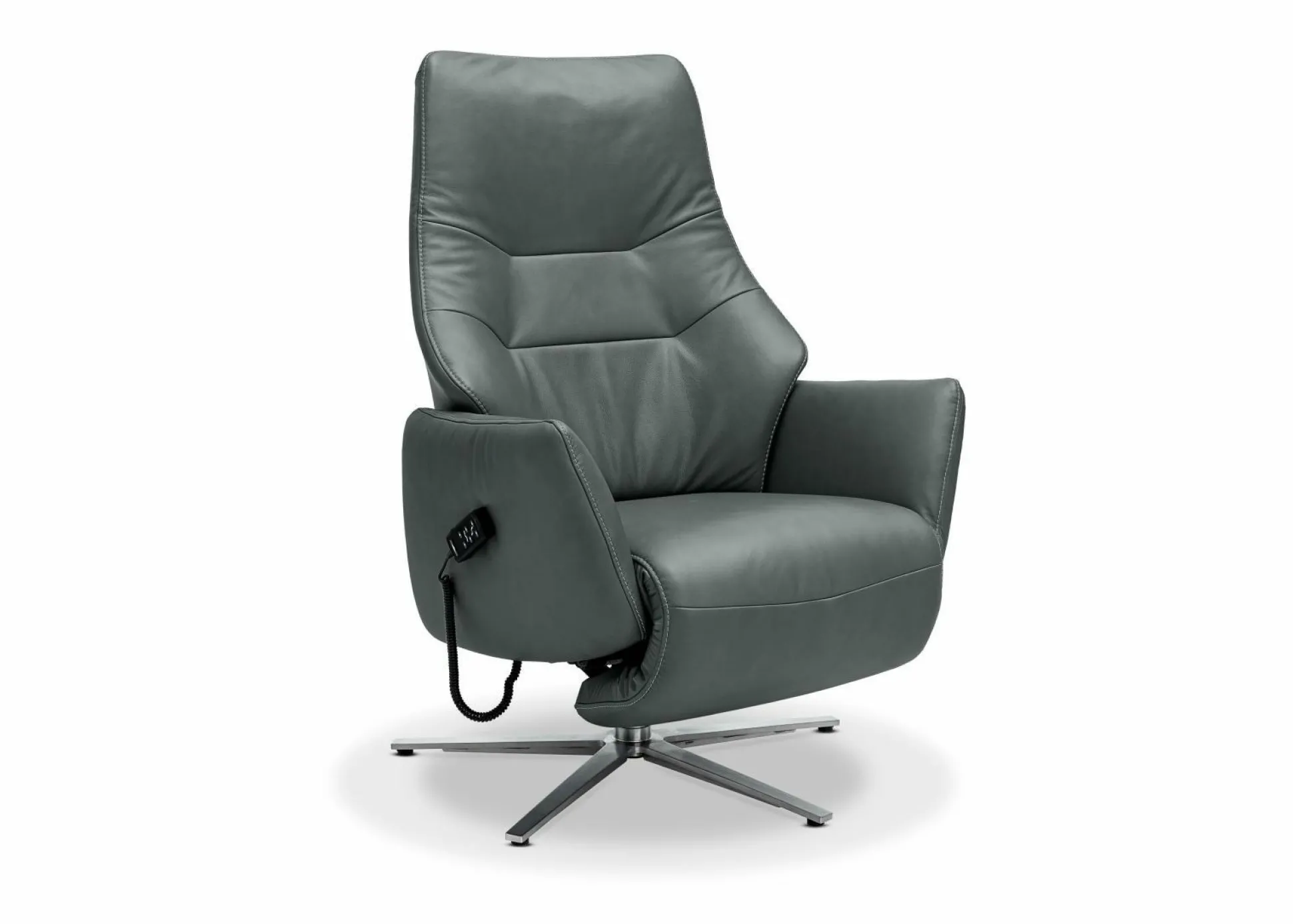 · Fernsehsessel Bezug Leder Longlife aqua. Sternfuß in Edelstahloptik. Inklusive 3-motorisch elektrische Fuß- und Rückenverstellung mit Herz-Waage-Funktion. Exklusive Dekoration.