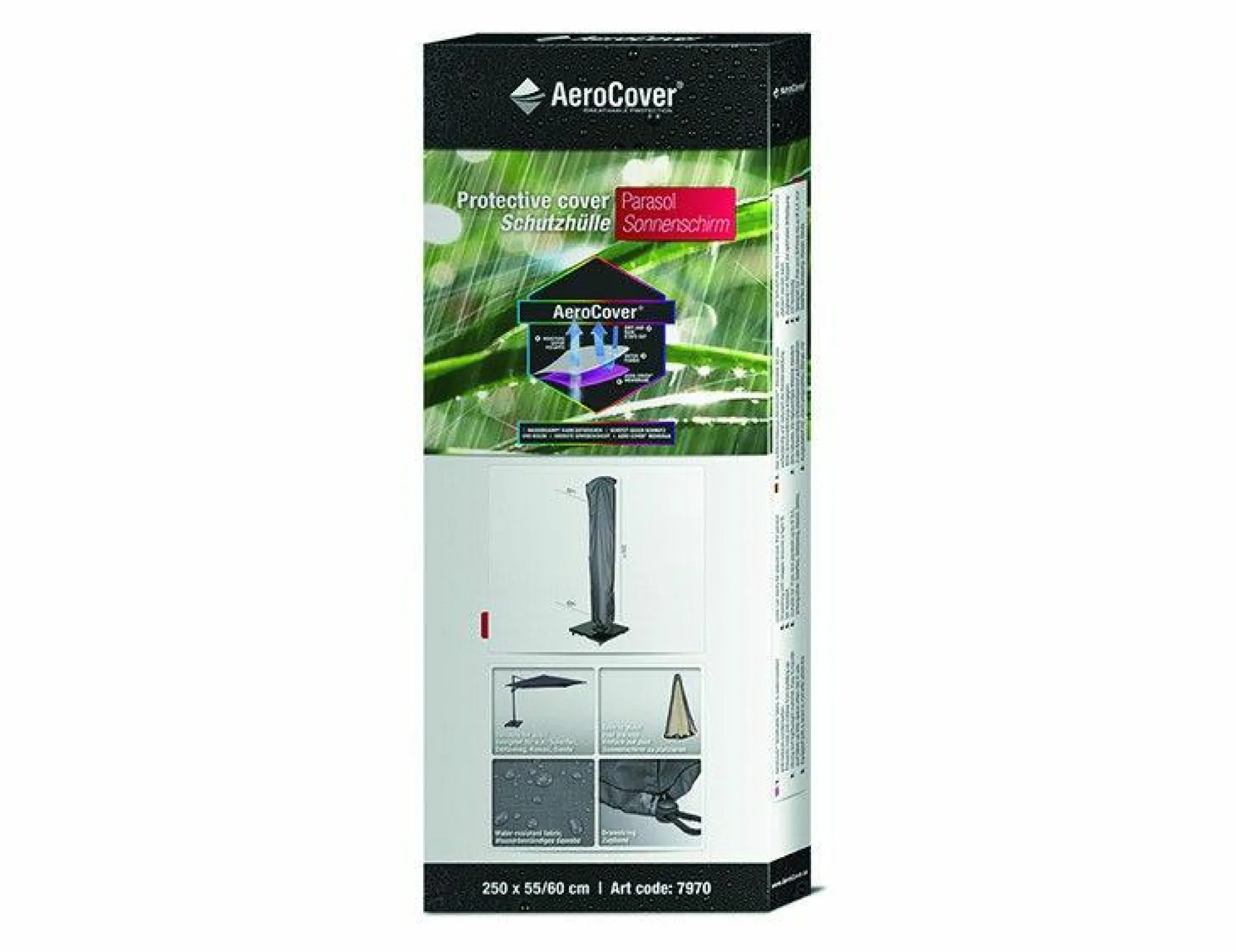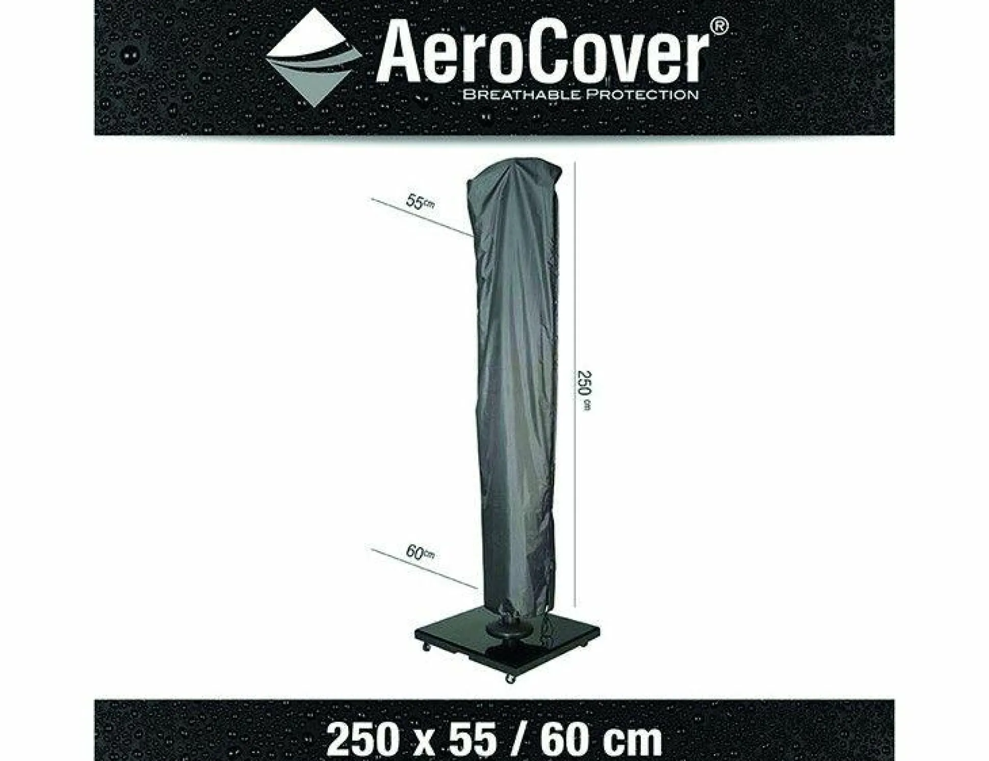 · Ampelschirm-Hülle 250x55cm von AeroCover. Atmungsaktive Schirm-Hülle. Schirm-Hülle passend für Ampelschirme mit einem Durchmesser bis zu 3,5 Meter und eckigen Schirmen 3×3 Meter. Eingenähter Glasfaser Stab. Dadurch ist ein einfaches Überziehen der Hülle, auch ohne die Nutzung einer Leiter, gewährleistet. AeroCovers sind aus leichtem Ripstop Polyester mit einer integrierten, atmungsaktiven Membran hergestellt. Das atmungsaktive AeroCover-Gewebe ist wasserbeständig und reduziert die Kondensbildung, wodurch der Bildung von Schimmel vorgebeugt wird. AeroCover Schutzhüllen verlängern die Lebensdauer Ihres Ampelschirms. Dank des dünnen Gewebes sind diese Hüllen besonders handlich in der Anwendung. Die Hülle ist mit einem Zugband mit zwei Stoppern ausgestattet, so dass eine optimale Befestigung sichergestellt ist Das AeroCover-Gewebe ist 100% wasserdicht, die Nähte sind spritzwasserfest.