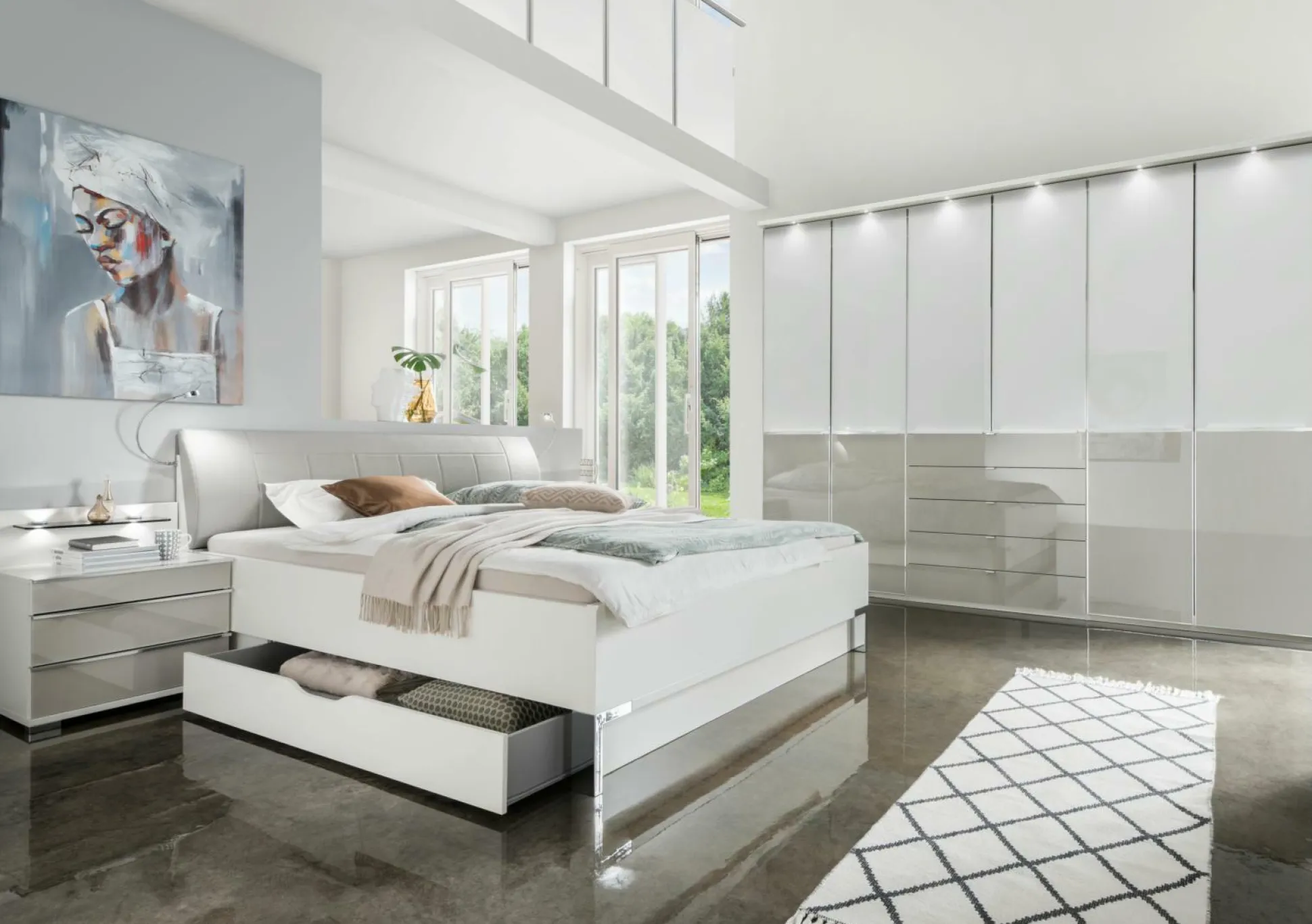 · Stellmaß: BHT ca 189x97x217cm 045 Nachtschrank-Paar, Front Glas Kieselgrau, BH 60/48 cm — Kranz, Passepartout, Beleuchtung, Nako-Paneele und Bettschubkästen auf Wunsch —