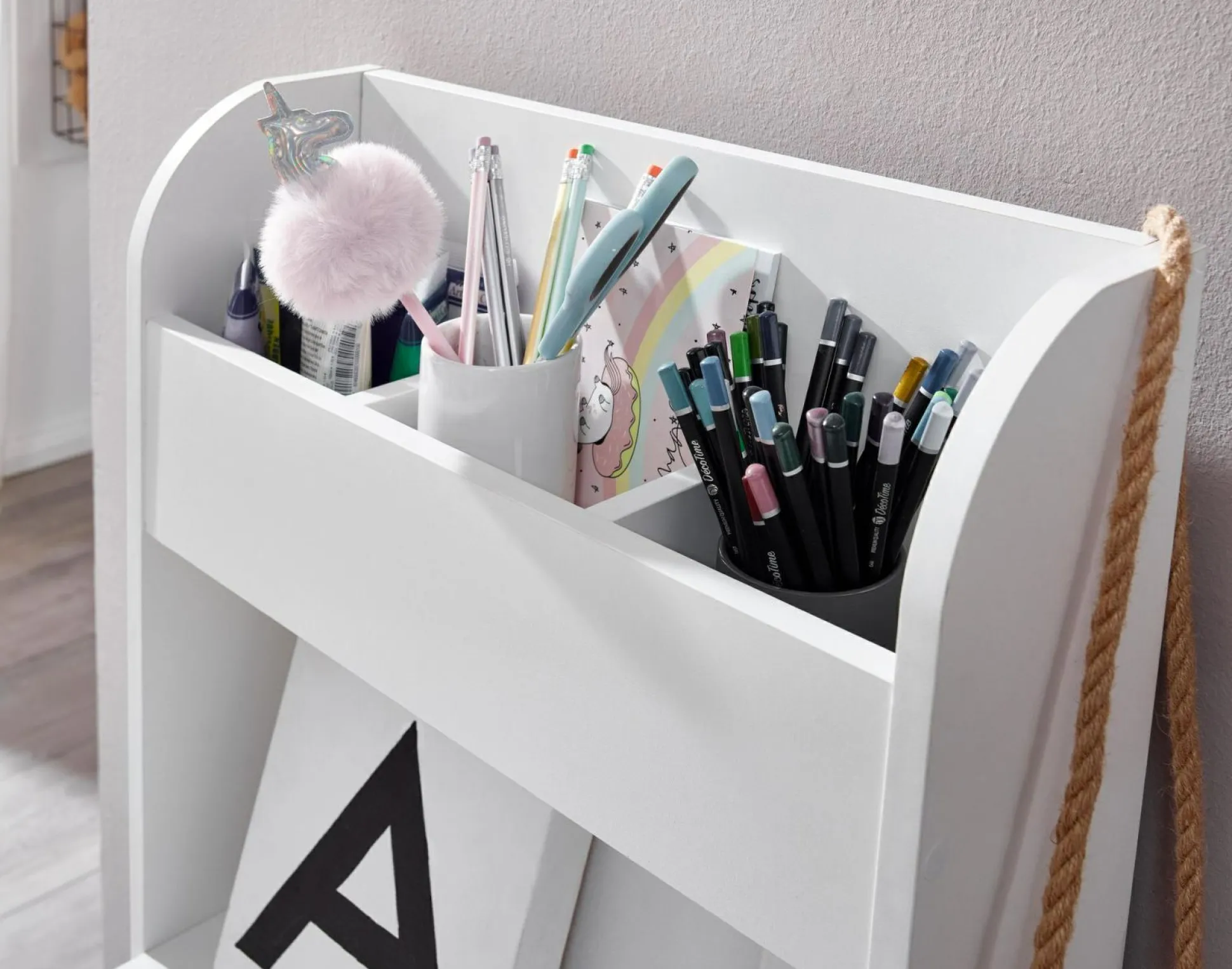 · Lieferumfang – Geliefert wird ein Kinderschreibtisch ohne Dekoration in versandsicherer Verpackung. Aufbauanleitung und Montagematerial liefen der Lieferung bei.