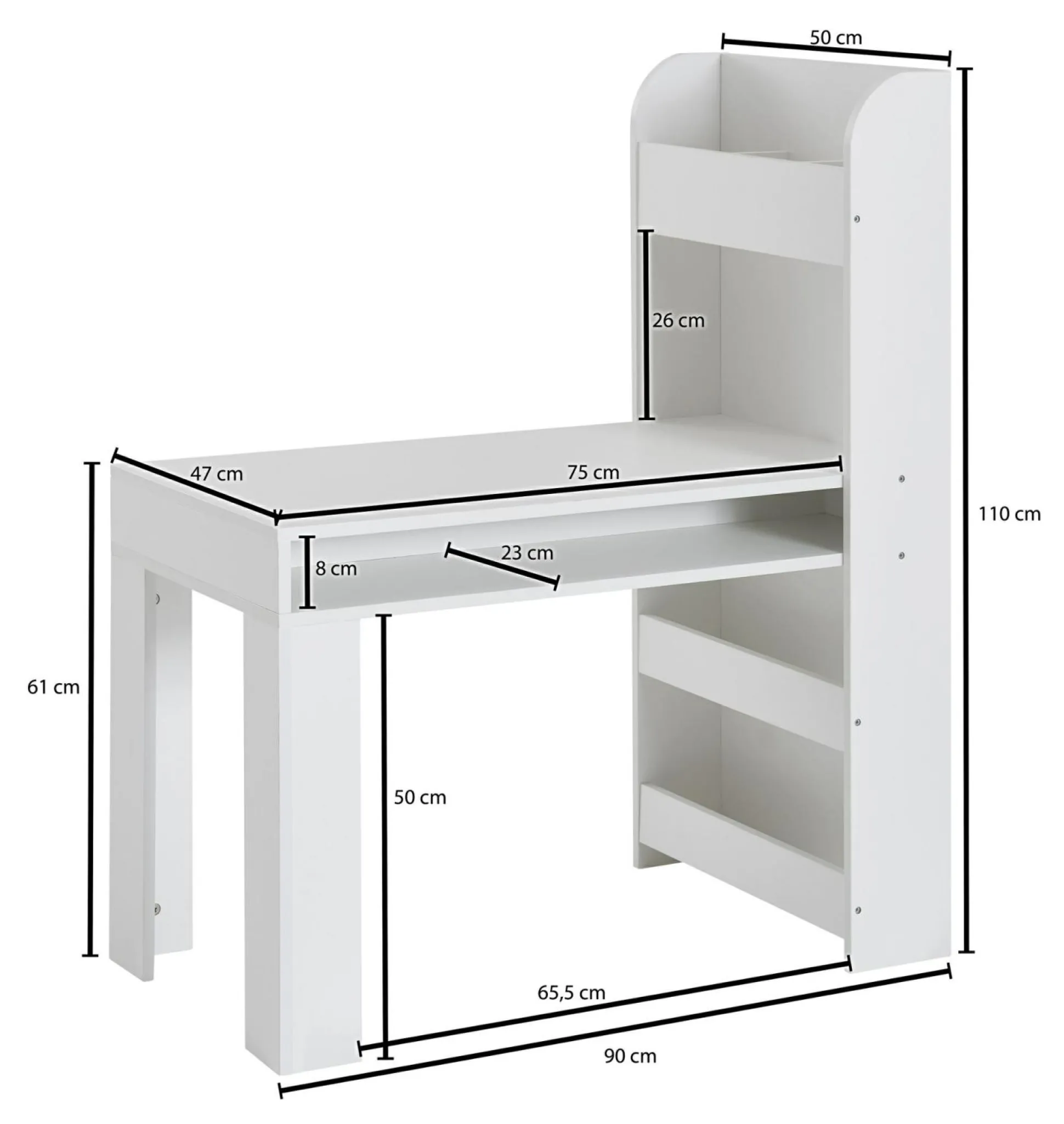 · Abmessungen – Arbeitsfläche (BxT): 75 x 47 cm, Höhe der Tischplatte: 61cm, Weitere Abmessungen finden Sie im Maßbild.
