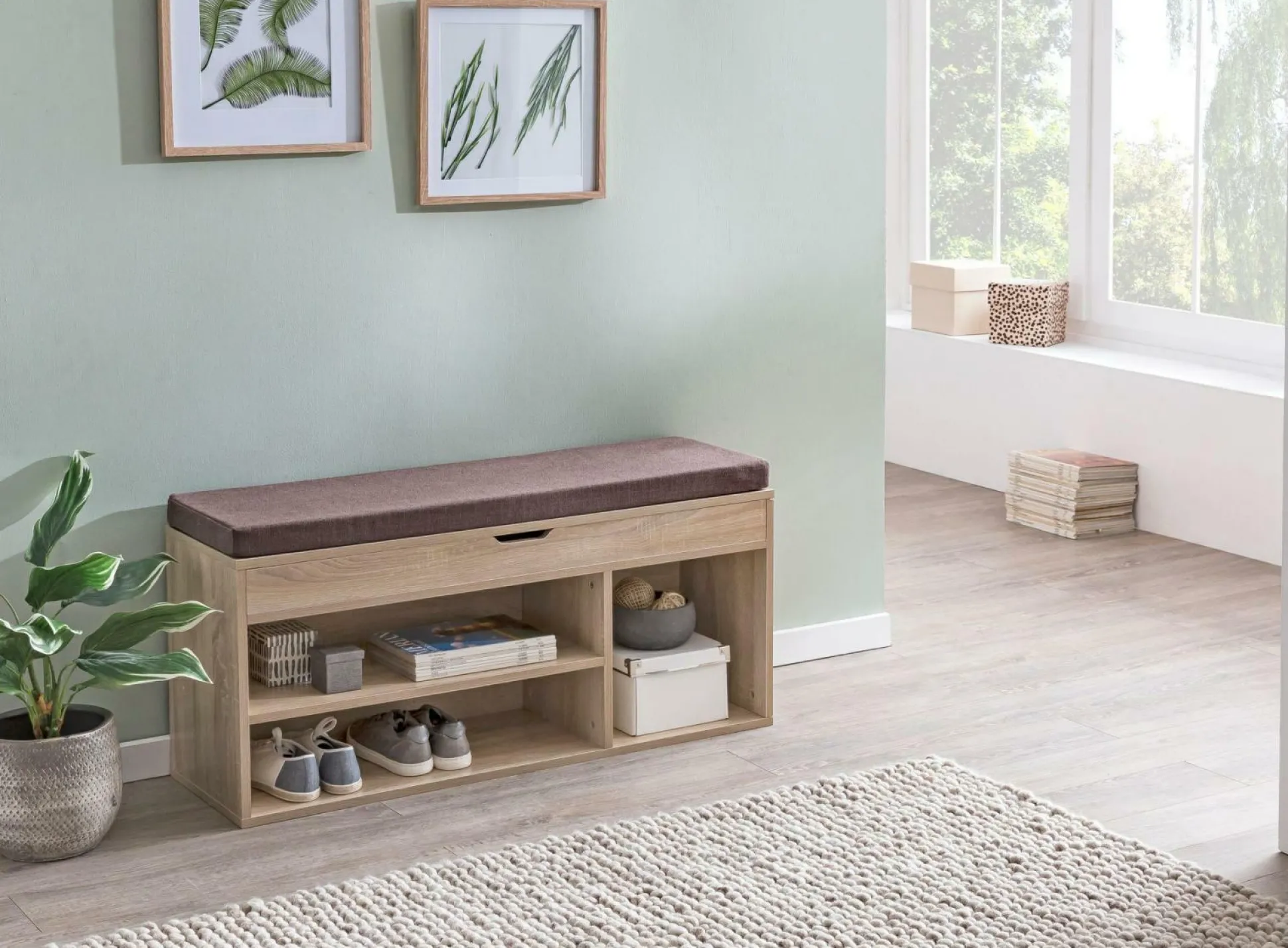 · Lieferumfang & Montage – Eine Schuhbank mit Polster ohne Dekoration, Montageanleitung und -material inklusive