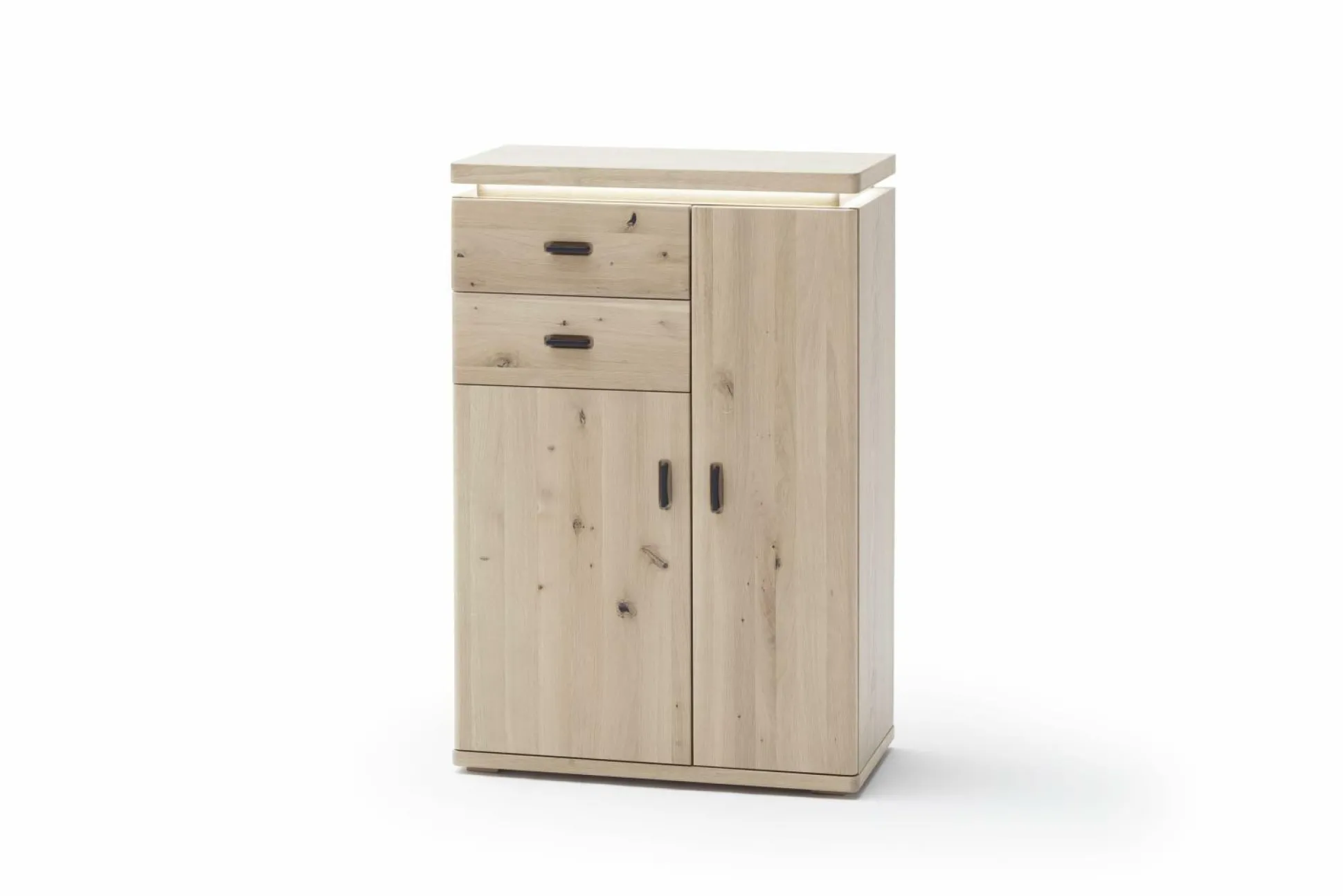 Die Kommode Madrid aus dem Hause HARPER wird die Natur ein Stück näher in Ihr Zuhause bringen und dabei für eine wohnliche Atmosphäre sorgen. Der Korpus ist aus furnierter Eiche bianco gefertigt und wird von einer Front aus Balkeneiche Bianco massiv mit durchgehenden Lamellen ergänzt. Die Oberflächen sind geölt. Die Rückwand hinter Türen und Schubkästen besteht aus Balkeneiche Nachbildung. Für ein abgerundetes Gesamtdesign sind die Griffe aus schwarzgrauem Metall gefertigt. Die zwei Schubkästen sind mit einer gedämpften Unterflurführung ausgestattet. Die zwei Türen mit Türdämpfung und sieben Einlegeböden bieten ausreichend Stauraum für Ihr Hab und Gut. Die Kommode kommt zusätzlich mit einer LED-Beleuchtung.