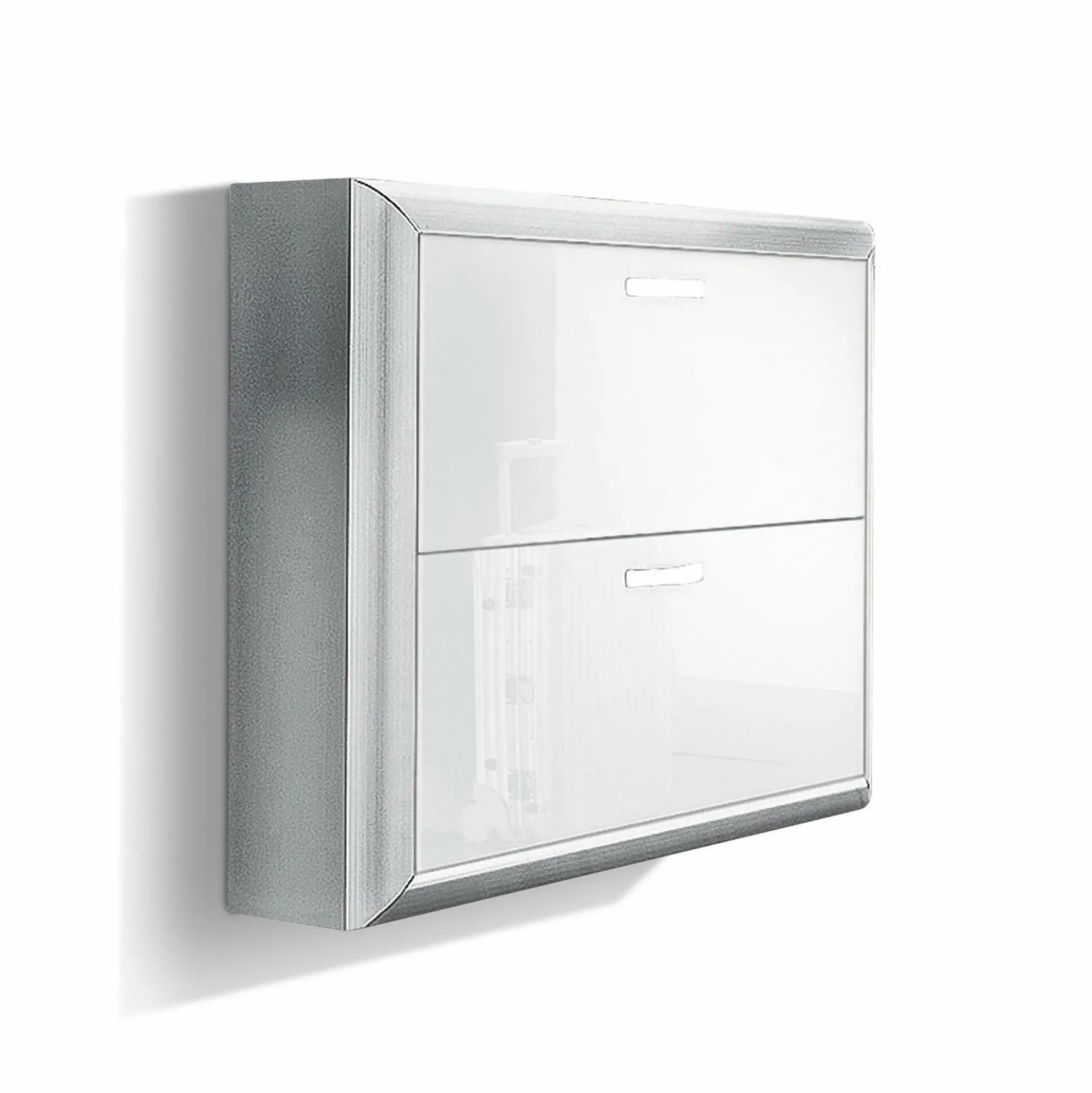 Der elegante Schuhschrank Mondo von ARREDOKIT hat einen formschönen Korpus aus Aluminium und verfügt über zwei geräumige Klappen, in denen Ihre Schuhe hervorragend Platz finden.