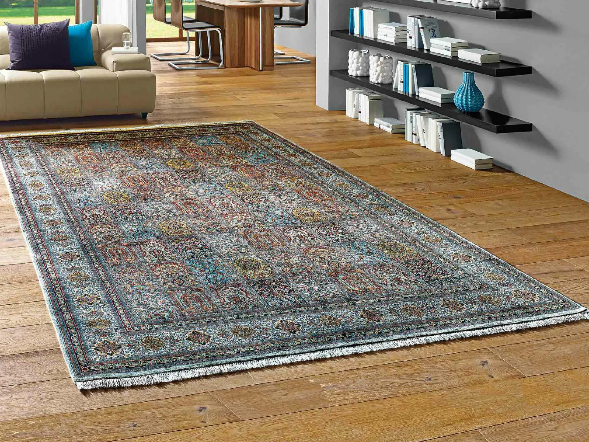 Dieser extravagante wie stilvolle Seidenteppich arrangiert jeden Wohnraum auf eine außergewöhnliche Art und Weise. Ein elegantes Dessin-Muster charakterisiert den antik anmutenden Teppich, der sich gleichfalls durch gute Gebrauchseigenschaften auszeichnet, jederzeit zu einem echten Unikat in Ihrem Zuhause.