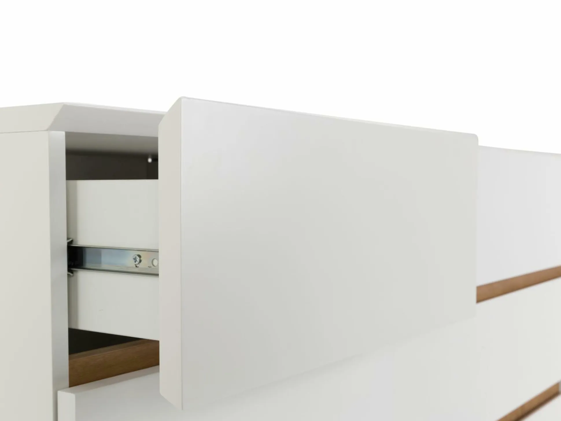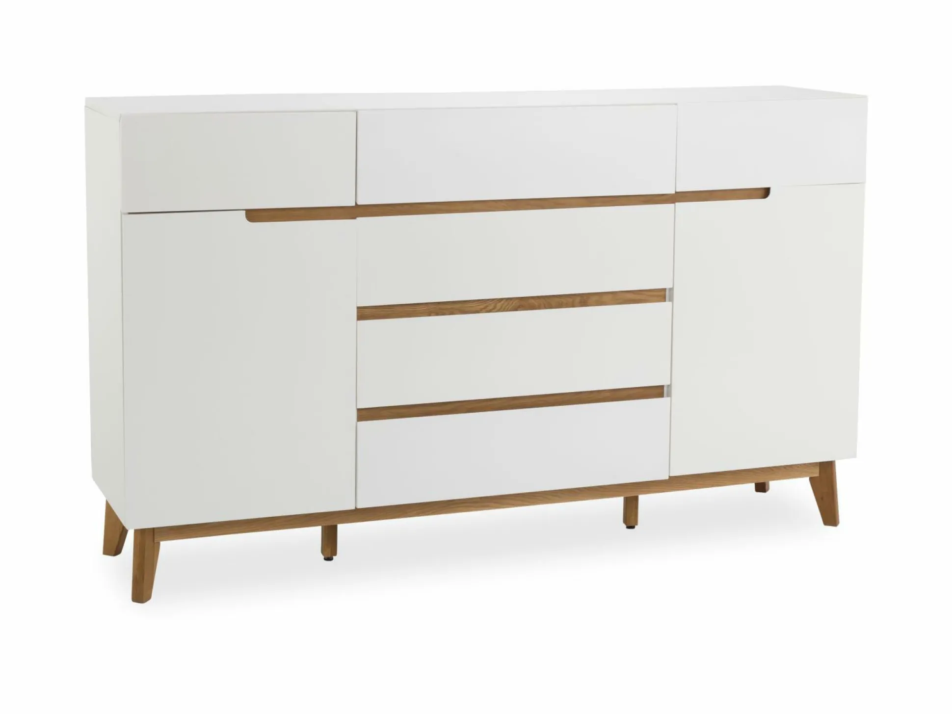 Das Sideboard Cervo überzeugt mit einem hellen und freundlichen Look in Ihrem Wohnbereich. Die schicke Anrichte ist in einer mattweißen Lackierung gehalten, die von Absetzungen und Beinen in Eiche ergänzt wird. Der skandinavische Look wird von dem kantigen Design von Form und Farbe unterstrichen. Darüber hinaus bietet die Anrichte viel Platz zum Verstauen und Aufbewahren hinter sechs Schüben und zwei Türen.
