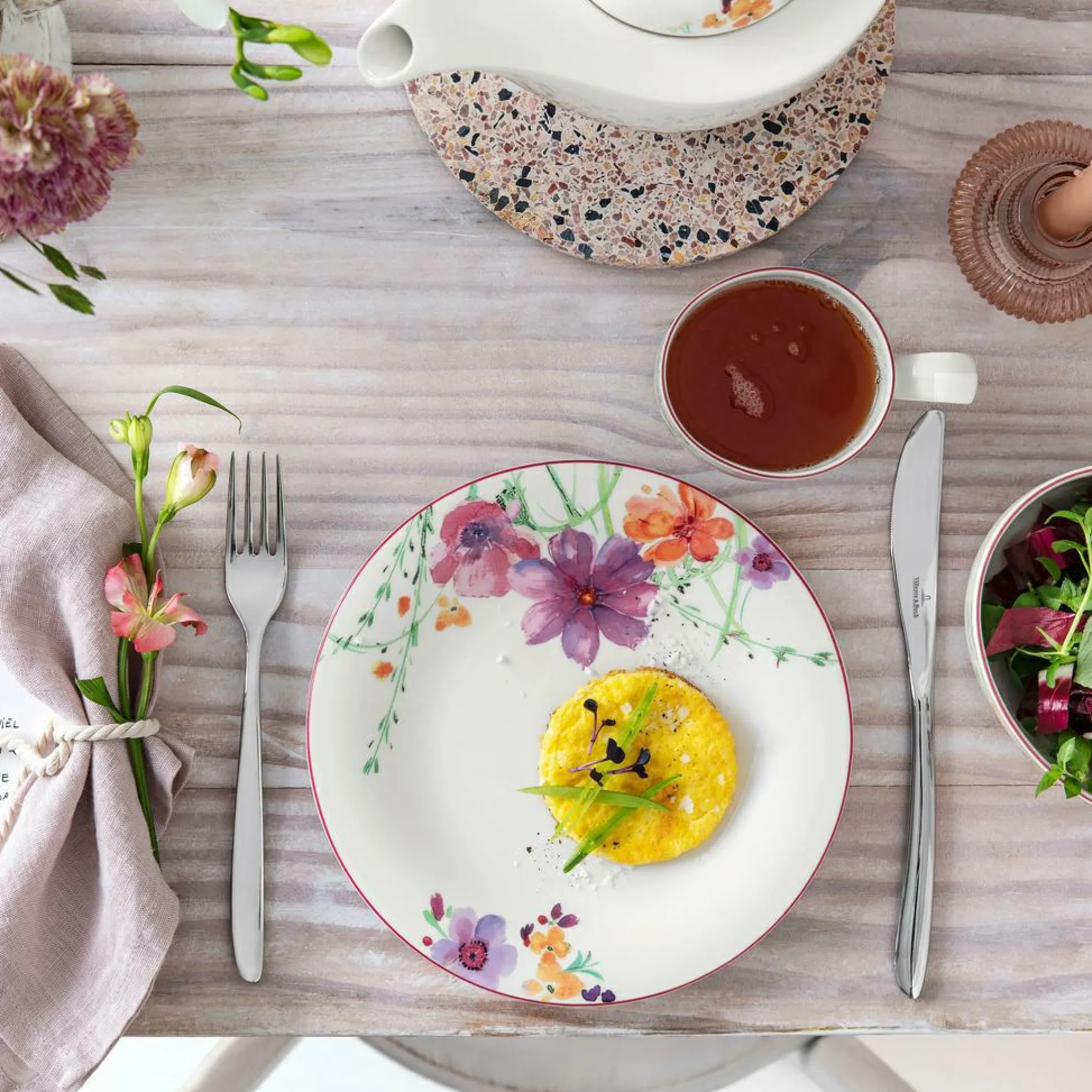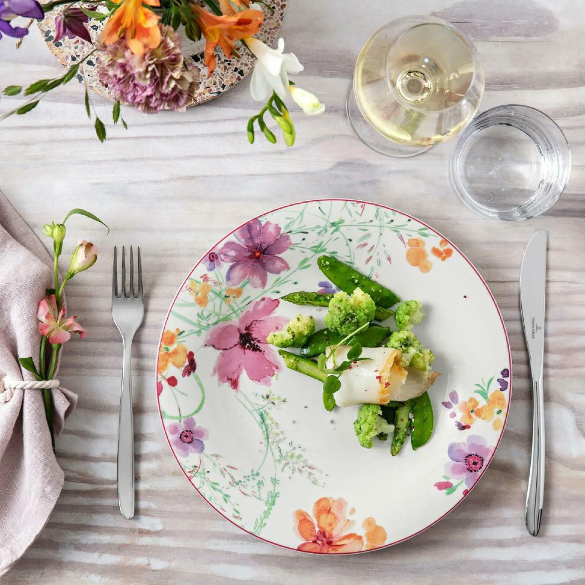 Der geschmackvoll gestaltete Speiseteller Mariefleur von Villeroy + Boch beschreibt ein attraktives Element für den gedeckten Tisch. Das schöne Muster auf dem Premium Porzellanteller besteht aus verschiedenen Blumen, die auf dem weißen Untergrund besonders hervorgehoben werden. Die schönen Farben und Form sind eine besondere Inspiration auf dem Tisch oder zur Verwendung als dekoratives Element.
