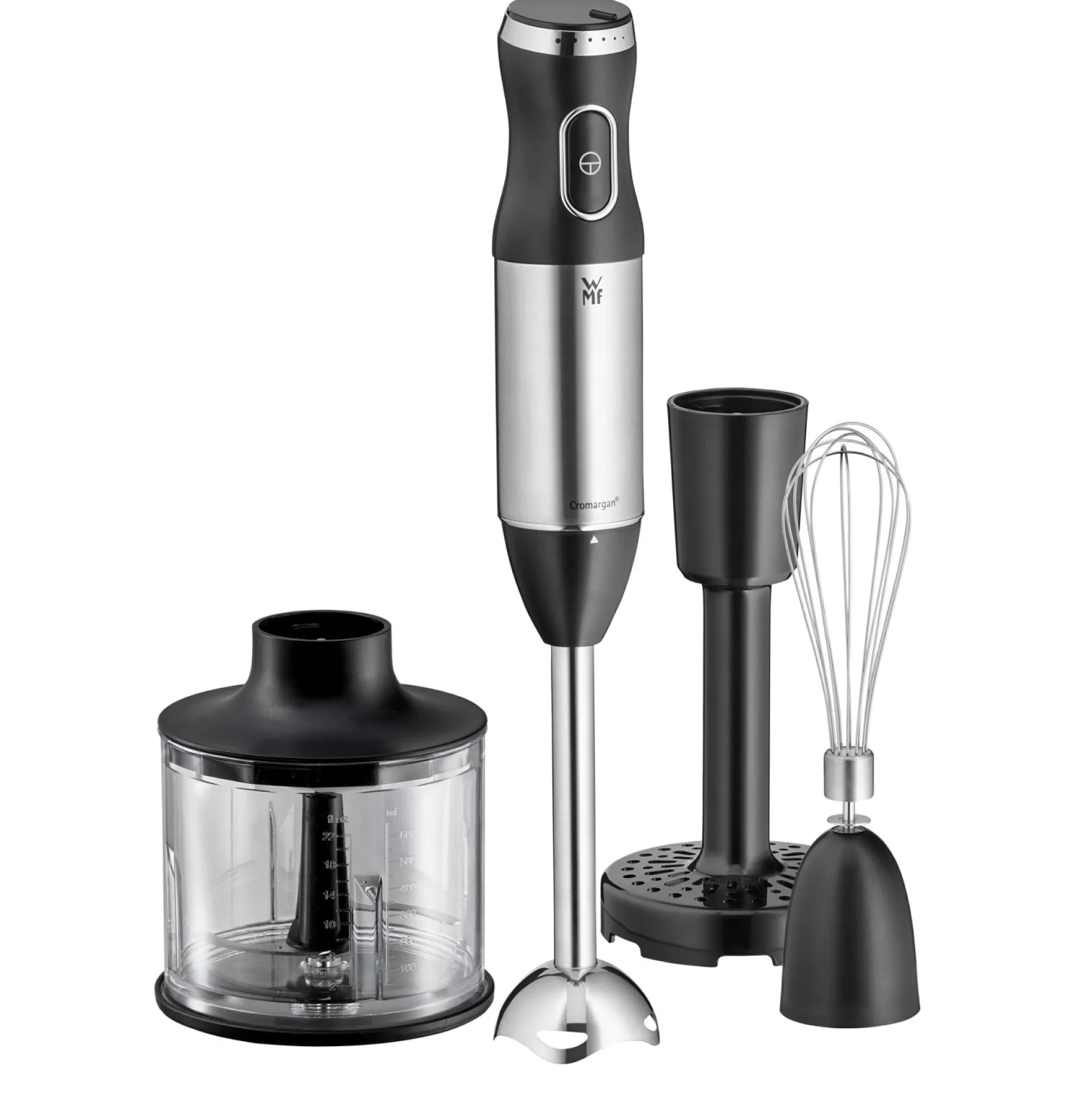 · Jeden Tag Neues probieren, Leckeres zaubern, Vielseitigkeit entdecken: Mit dem WMF Kult X Stabmixer-Set sind Ihrer kulinarischen Inspiration und Kreativität keine Grenzen gesetzt. Auf Knopfdruck verwandelt der leistungsfähige Mixer mit der Kraft aus 600 Watt in Sekundenschnelle die unterschiedlichsten Zutaten in köstliche Dips, Suppen, Smoothies, Pesto, Guacemole und viele weitere Geschmacksbomben. Und das Set kann noch mehr: Der Schneebesenaufsatz eignet sich ideal zum Aufschlagen von Sahne, Eiweiß und die Zubereitung leichter Teige, der Pürieraufsatz zaubert cremige Pürees oder bringt Babynahrung in die perfekte Konsistenz für die Kleinsten. Abgerundet wird das clevere 4-in-1-Komplettpaket durch einen praktischen und robusten 700-ml-Mixbecher. Der Stabmixer ist kinderleicht und sicher zu bedienen, liegt ergonomisch in der Hand und bietet dank der WMF 2+2 Messertechnologie mit hochwertigen Edelstahlklingen Tag für Tag beste Mixergebnisse für noch mehr Abwechslung in Ihrer Küche.