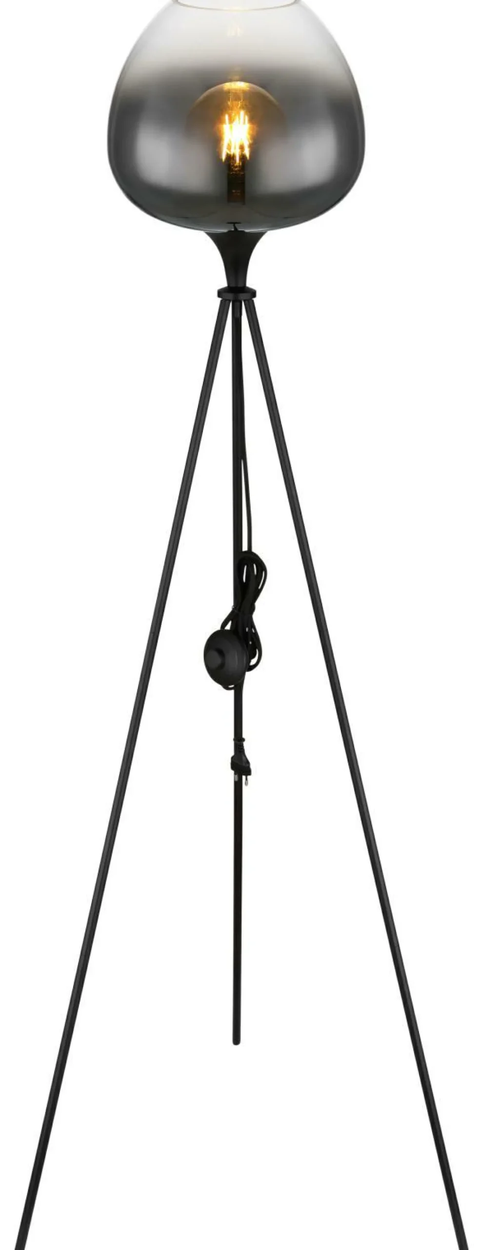 · Diese moderne Stehleuchte begeistert durch ein tolles Design. An einem 125 cm großen Dreibein aus matt schwarzem Metall befindet sich eine E27 Fassung mit einem formschönen rauchfarbenen Glasschirm (Ø 29 cm). Die E27 Fassung ermöglicht Ihnen bis zu einer maximalen Leistung von 60 Watt, selbst über Lichtfarbe und Helligkeit zu bestimmen. Aufgrund von Langlebigkeit uns Stromersparnis empfehlen wir LED Leuchtmittel.