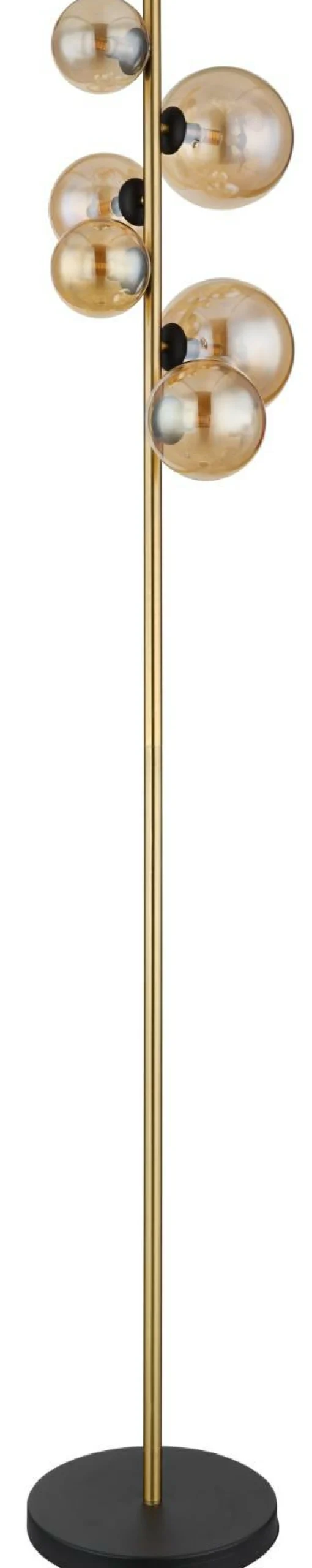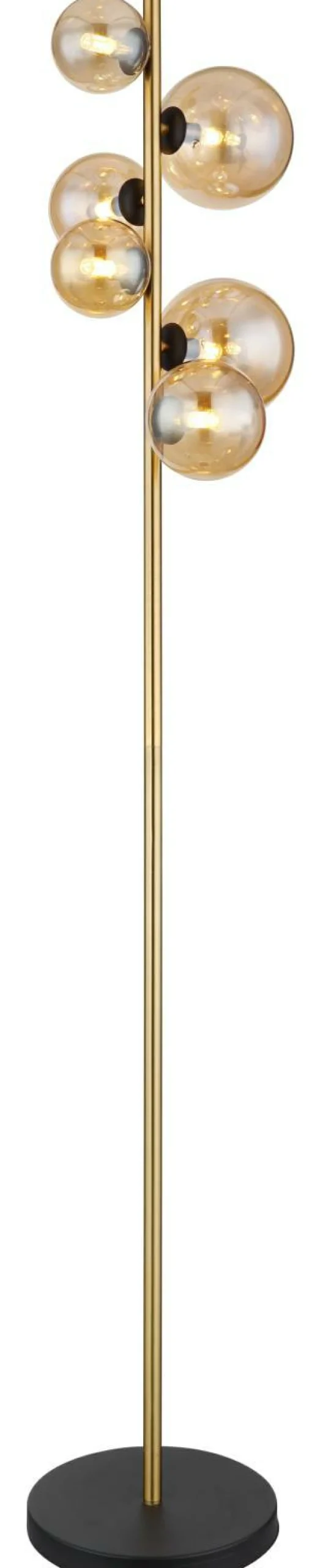 · Diese faszinierende Stehleuchte der Serie RIha überzeugt durch tolles Design. Aus einem runden schwarz matten Sockel ragt eine ca 1,6m große Metallstange in schönen Messing, bestückt mit sechs unterschiedlich großen G9 LED Leuchtmitteln und jeweils einem Glasschirm in Amber. Die G9 LED Leuchtmittel geben ein 3000 Kelvin warmweißes Licht ab und erschaffen somit eine angenehme Atmosphäre. Durch weitere Modelle dieser Serie können Sie Ihren Wohnbereich perfekt ergänzen.