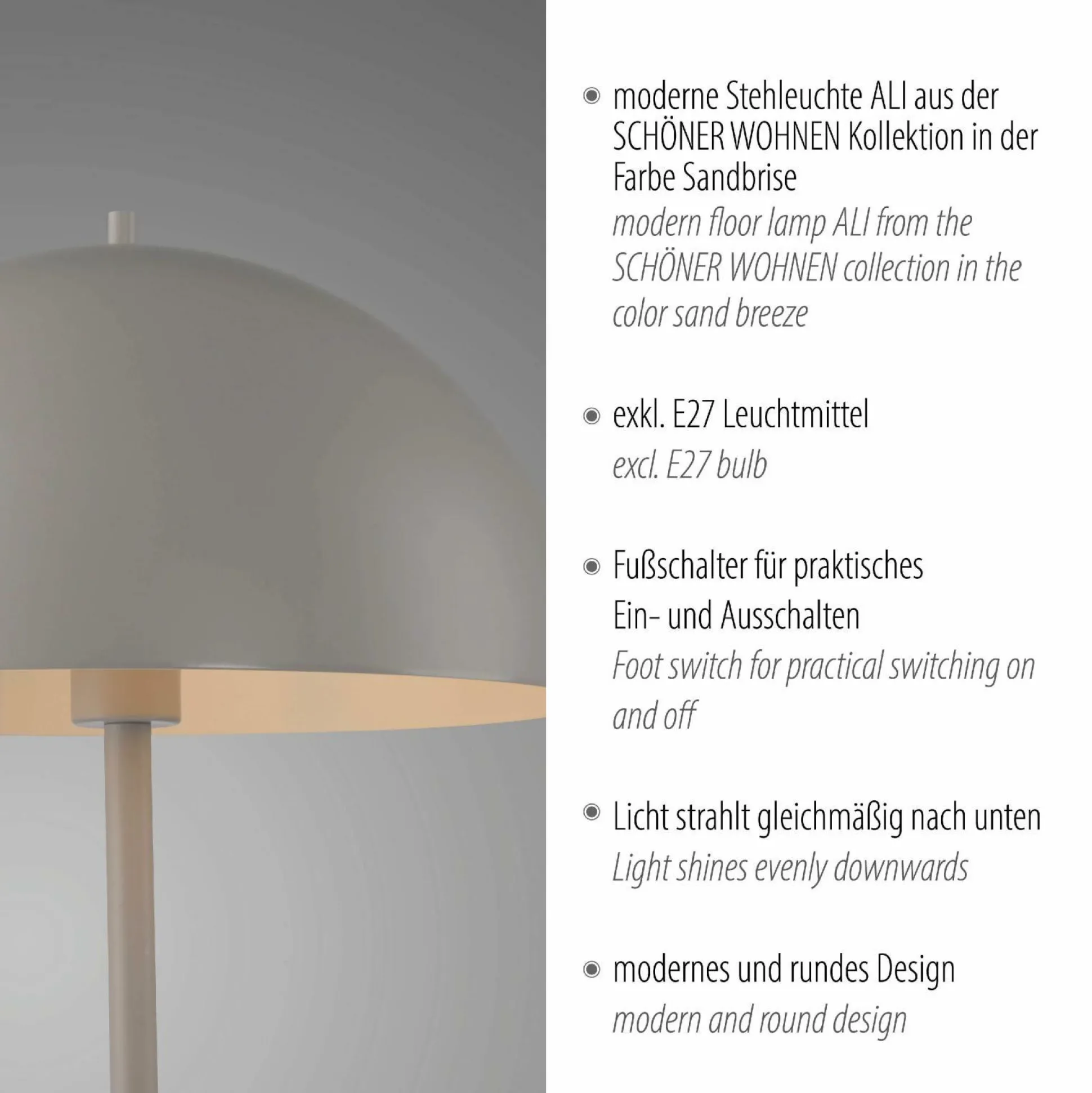 Lichtdesign in seiner dekorativsten Form verheißt die Stehlampe SCHÖNER. Die Lampe begeistert in Markenqualität von SCHÖNER WOHNEN mit gut durchdachtem Design und einem einzigartigen Wohnerlebnis. Sie erweitert das Lichtkonzept jeglicher Zimmer durch ihr stilsicheres Aussehen auf angenehme Art und Weise. Das Modell SCHÖNER weist eine Länge von 38 Zentimetern, eine Gesamtbreite von 38 Zentimetern und eine Höhe von 155 Zentimetern auf. Die Stehleuchte hat eine E27-Fassung. Sie sorgt für eine schöne Optik und schenkt Ihren Wohnräumen mehr Atmosphäre. Das Modell SCHÖNER vervollständigt Ihr persönliches Einrichtungskonzept durch das skandinavische Design. Durch das schöne Licht der Stehleuchte wird jeglicher Raum optimal in Szene gesetzt. Diese Stehlampe kreiert ein behagliches Flair.