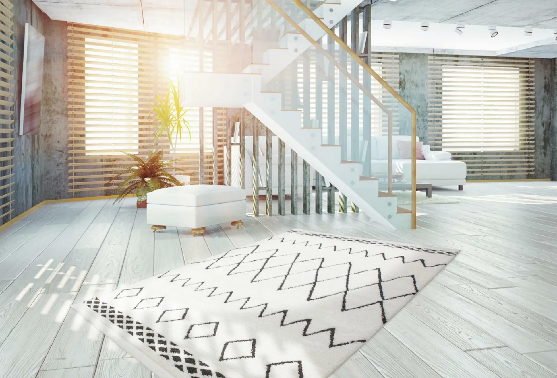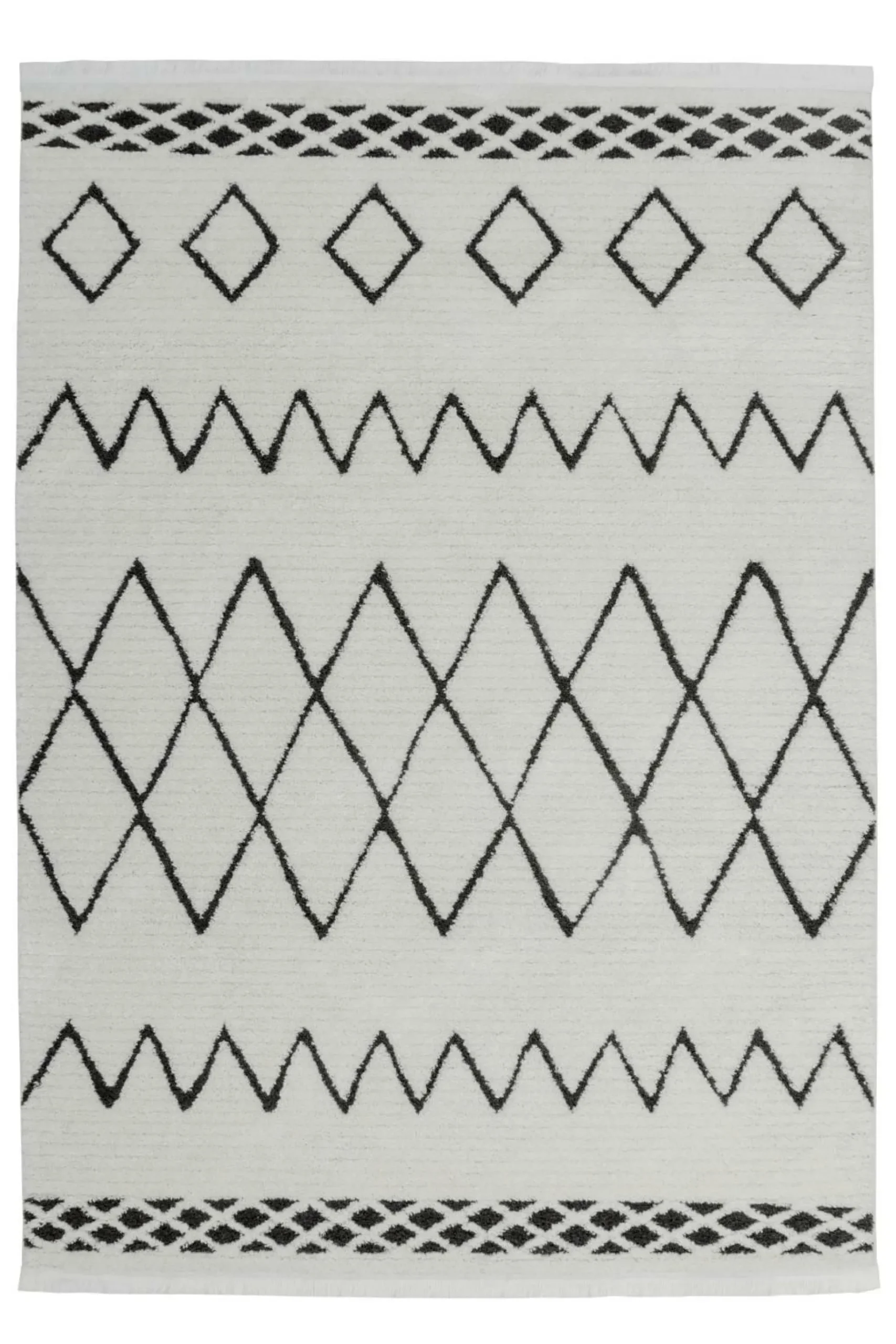 · Bringen Sie mit diesem Hochflorteppich frischen Wind in Ihr Zuhause. Das moderne schwarze Ethno-Muster verziert den hellen Teppich ideal und wird durch die dekorativen und weichen Fransen an den Teppichenden noch unterstrichen. Die schlichten Farben in aufregendem Design aus geometrischen Formen werten nicht nur moderne Einrichtungen auf, sondern auch klassische oder rustikale Wohnstile. Statten Sie Ihre Wohnräume mit Ihrem neuen Hochflorteppich aus und schaffen Sie eine gemütliche Atmosphäre, egal ob in Wohnzimmer, Schlafzimmer oder Eingangsbereich. Mit modernen Teppichen von Kayoom holen Sie sich Blickfänge nach Hause. Damit für jede Wohnsituation ein passendes Exemplar dabei ist, ist der Teppich in verschiedenen Größen erhältlich. Der robuste und strapazierfähige Teppich lässt sich durch den Material-Mix aus Polypropylen (70 %) und Polyester (30 %) auch in viel genutzten Wohnbereichen gut auslegen.