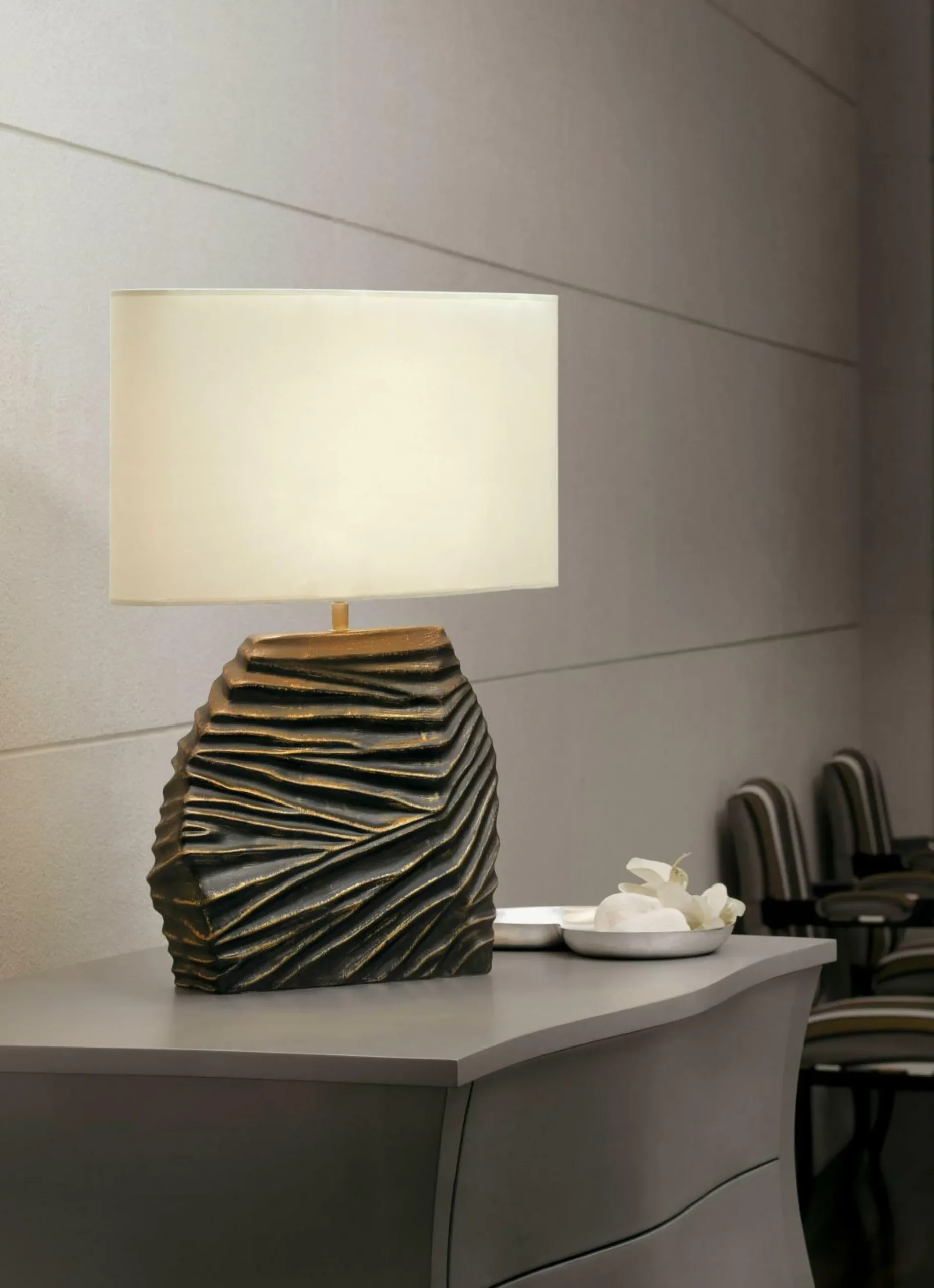 Ob ein- oder ausgeschaltet, diese Tischleuchte macht eine hervorragende Figur. Das Modell DUNE präsentiert sich in einem hervorragenden Design und integriert sich auf tolle Weise in Ihr Zimmer. Es hat nicht nur eine Breite von 45 cm, sondern auch eine Höhenabmessung von insgesamt 65 cm und eine Tiefe von 17 cm. In ihrem modernen Design macht die Lampe eine hervorragende Figur. Für die Fassung werden Leuchtmittel mit einem E27-Sockel benötigt. Das Modell DUNE besticht mit der Qualität der verwendeten Keramik. Die tolle Tischleuchte fügt sich mit ihrem schönen Design perfekt in Ihren Einrichtungsstil ein und erstellt dort eine angenehme Atmosphäre. Ihr Interieur wird aufgrund der Tischlampe gekonnt ergänzt. Mit dieser Tischleuchte schmücken Sie Ihre vier Wände.