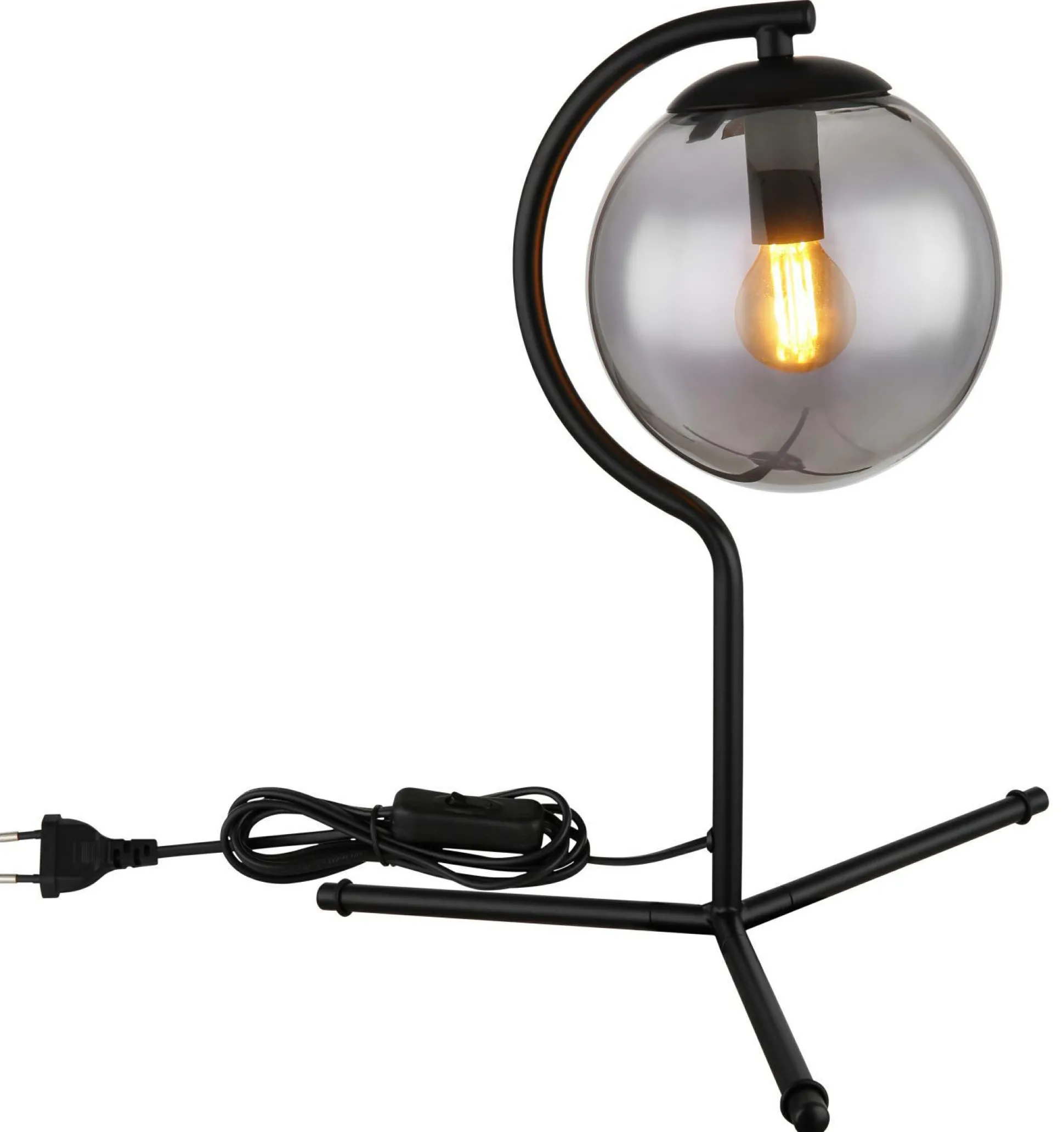 · Diese schlichte Tischleuchte begeistert durch modernes Design. Aus einem Dreibein ragt eine 35 cm lange schwarz matt geschwungene Metallstange und mündet an einer E14 Fassung welche mit einem rauchfarbenen Glasschirm (Ø 15cm) ausgestattet ist. Die E14 Fassung ermöglicht Ihnen bis zu einer maximalen Leistung von 25 Watt, selbst über Lichtfarbe und Helligkeit zu bestimmen. Aufgrund von Langlebigkeit und Stromersparnis empfehlen wir LED Leuchtmittel.