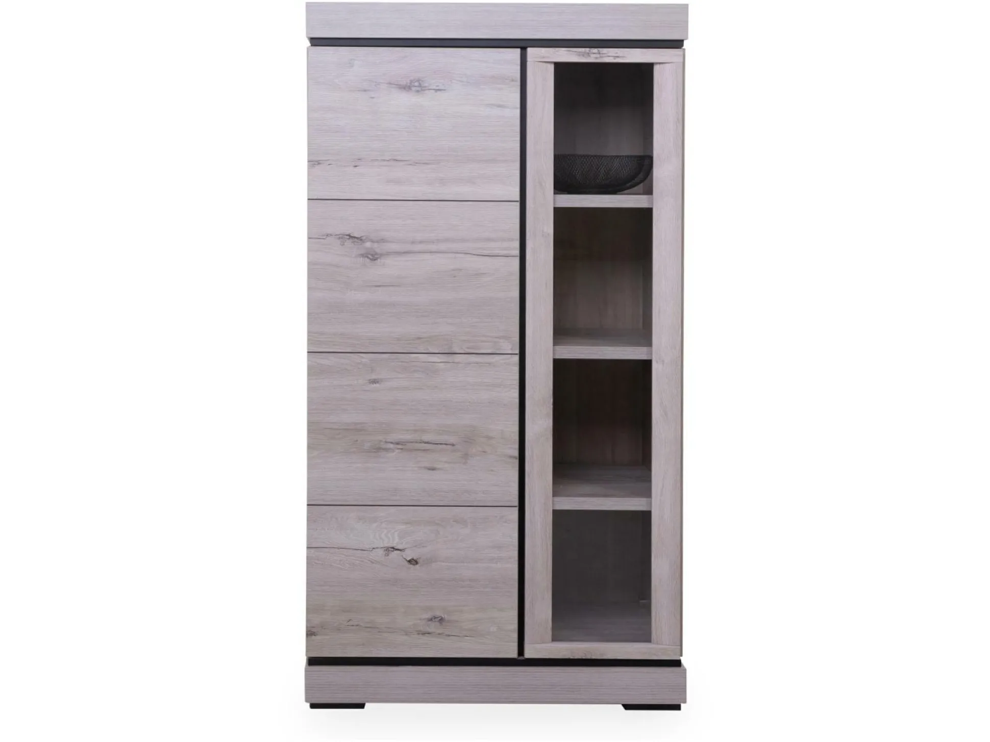 Erwecken Sie Ihre Wohnräume zum Leben mit der Vitrine BELLUNO und schaffen Sie eine ansprechende Präsentationsfläche für Ihre Lieblingsstücke. Mit ihrem ansprechenden Design in hellgrauer Eichen Nachbildung verleiht sie Ihrem Raum eine moderne und zugleich natürliche Note. Die push-to-open Türen ermöglichen einen bequemen Zugang zu Ihrem Geschirr und Ihren Dekorationsartikeln. Mit einer Holztür rechts und einer Glastür links bietet die Vitrine großzügigen Stauraum und vielseitige Präsentationsmöglichkeiten. Die integrierte LED-Beleuchtung hinter den Glastüren schafft eine einladende Atmosphäre und setzt Ihre Lieblingsstücke gekonnt in Szene. Inklusive sind ein 3 m Kabel, Stecker und ein Druckschalter für eine einfache Handhabung und Installation. Bringen Sie Stil und Funktionalität in Ihr Zuhause mit der Vitrine BELLUNO.