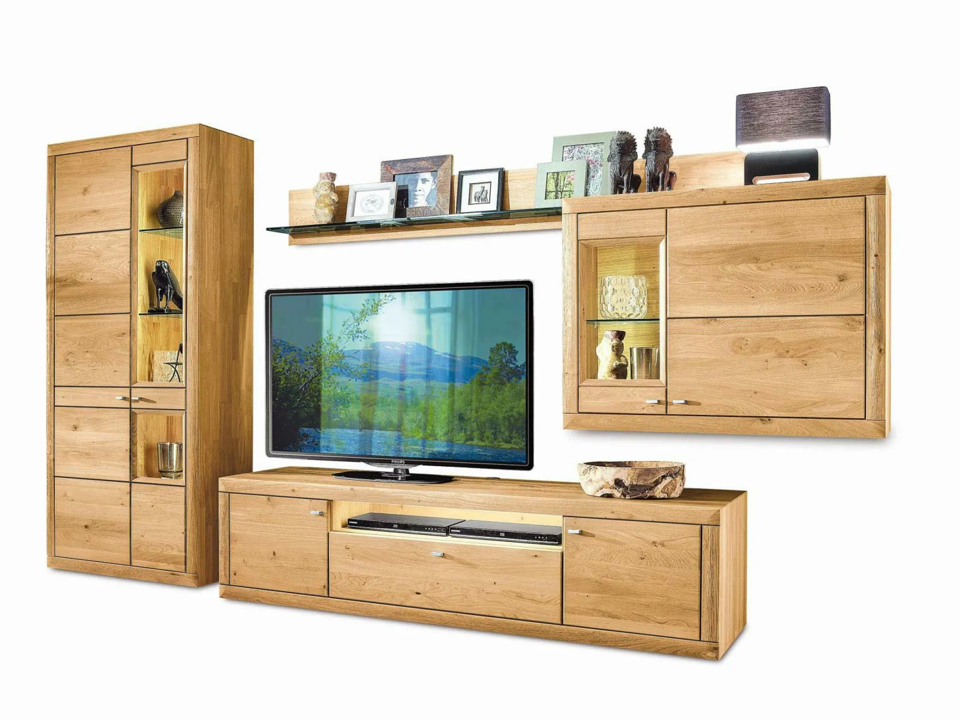 Kombielement Ancona von witlake lässt in Sachen moderner Stauraumgestaltung keine Wünsche mehr offen. Der hochwertige Schrank ist aus soft gebürsteter, europäischer, massiver Wildeiche gefertigt, deren edle Holzmaserung für ein natürliches und stilvolles Ambiente im Wohnraum sorgt. Eine robuste Holztür und eine schicke Holz-Glastür rechts bieten sowohl jede Menge Stauraum als auch geschmackvolle Präsentationsmöglichkeiten für besondere Dekorationen.