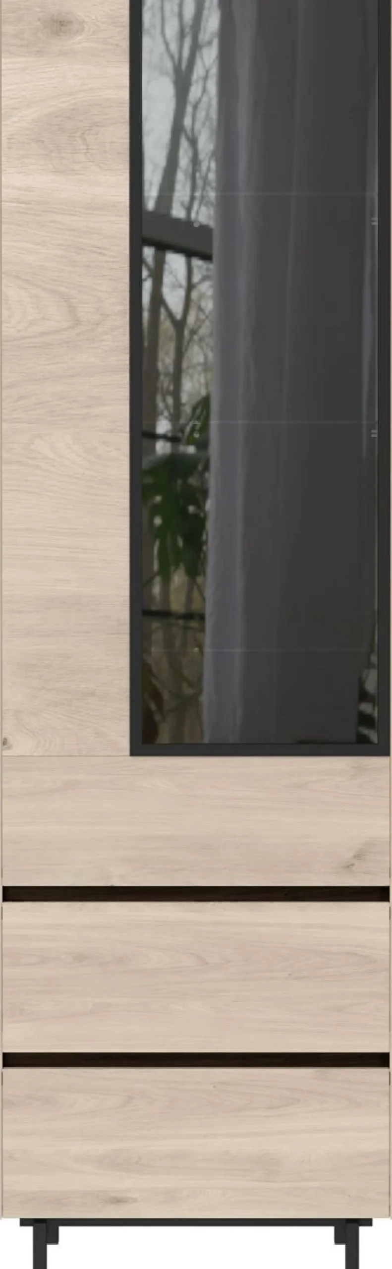 · Vitrine mit drei Schubladen (jeweils belastbar bis zu 10 kg) und einer Tür mit Aluminiumrahmen in Schwarz und Glaseinsatz aus Rauchglas in Grau, dahinter 3 verstellbare Einlegeböden aus Glas (belastbar bis zu 10 kg), Zwischenboden bis zu 10 kg belastbar, Ober-, Sockelboden und Rückwand in Schwarz, Seiten, Einlegeböden und Fronten in Eiche, Fußgestell aus pulverbeschichtetem Metall in Schwarz oder optional 4 Möbelgleiter aus Kunststoff in Schwarz, Melaminharzbeschichtung, hochwertige ABS-Kanten, grifflose Optik, Tür Push-to-open, Schubladen mit Selbsteinzug, Türdämpfung, nachhaltige Verpackung, Made in Germany.