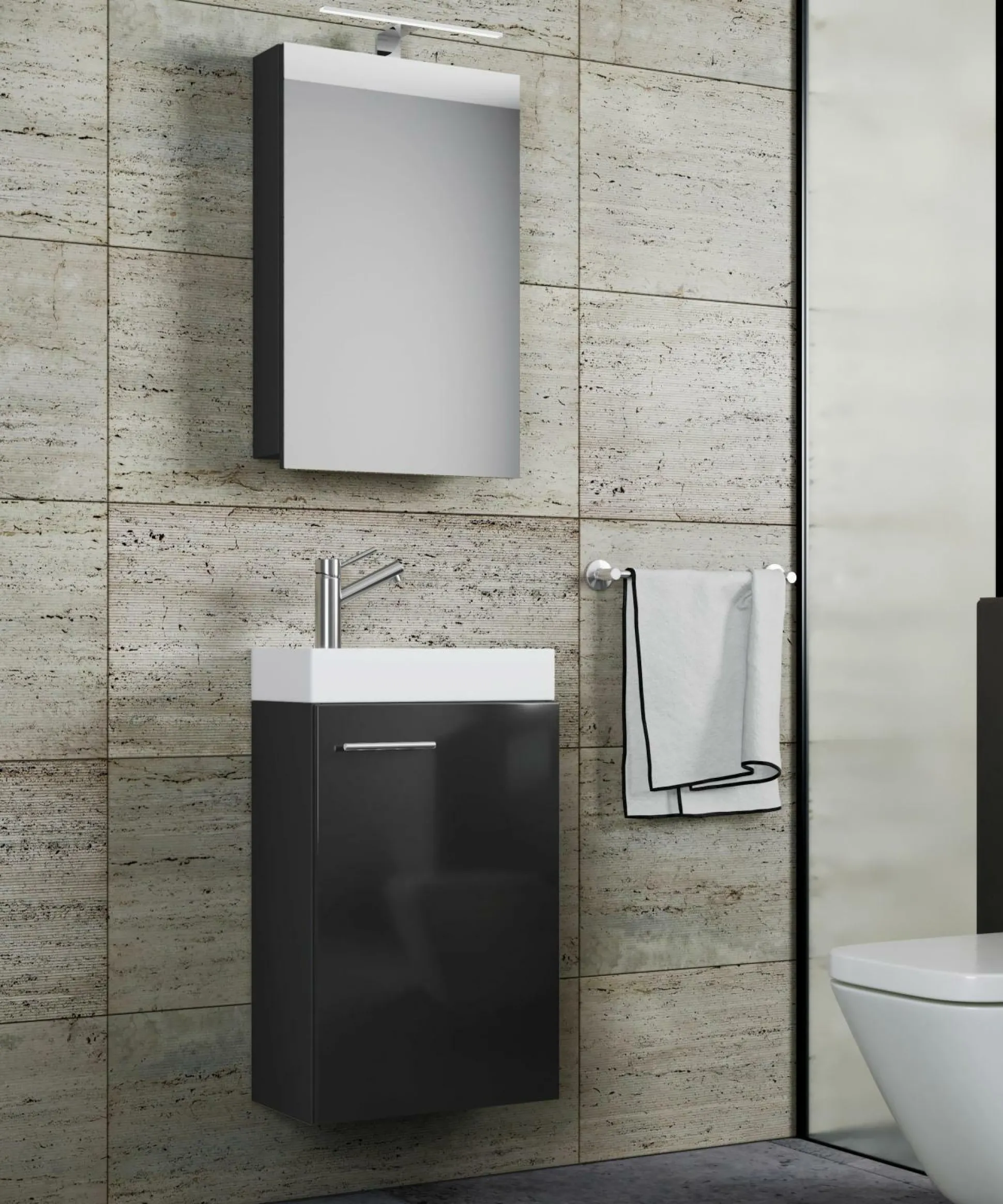 · Das moderne Bad-Set Slito mit Spiegelschrank eignet sich für ein Gäste-WC oder kleines Bad.
