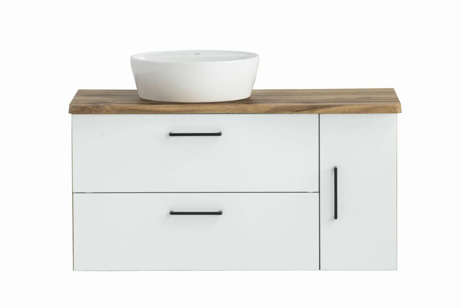 · Waschtisch mit zwei Metall- auszügen mit Softclose-Funktion und Reling, einer Tür rechts, gedämpft und einem Einlegeboden