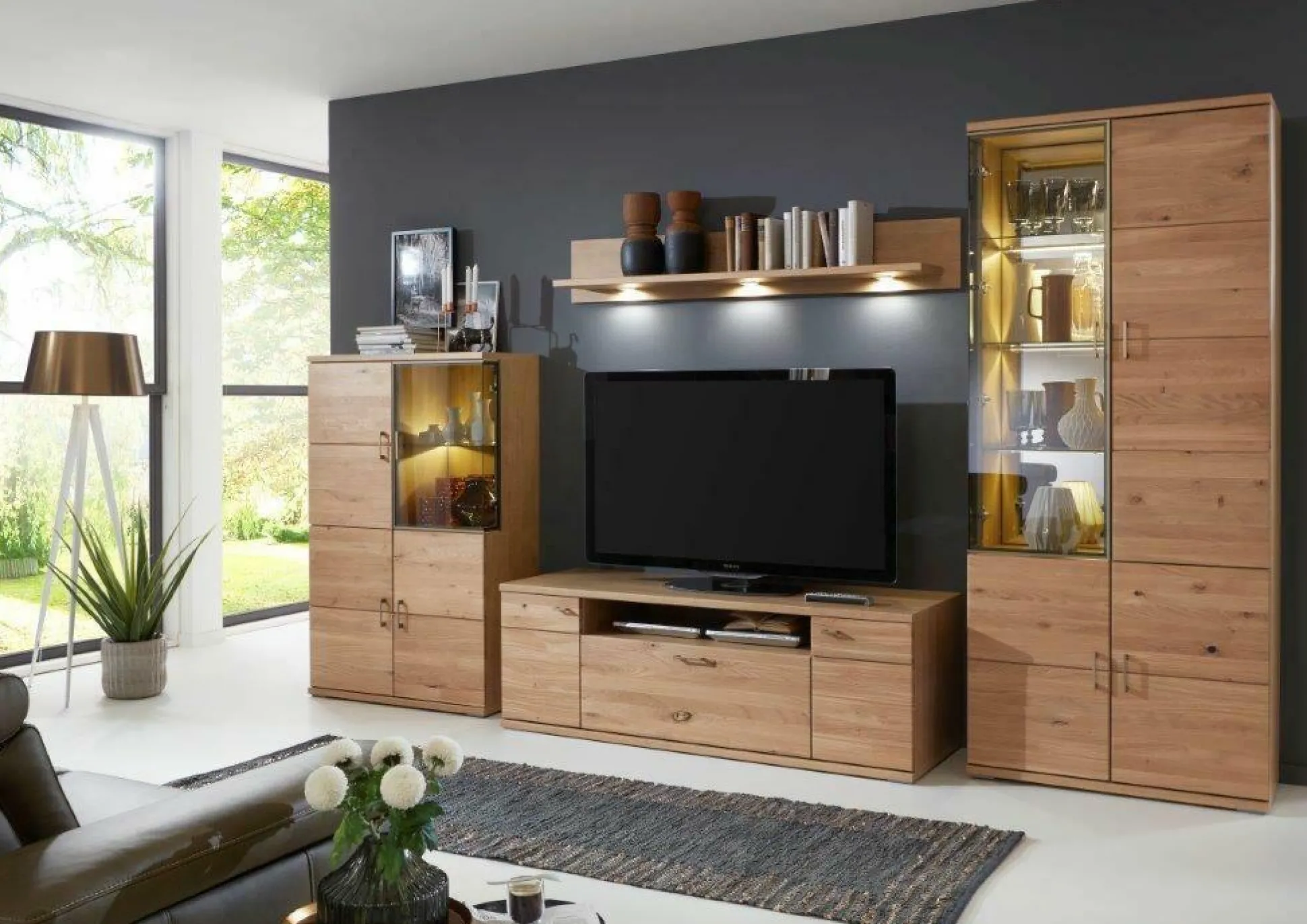Schaffen Sie eine angenehme Atmosphäre in Ihren Wohnraum mit der Wohnwand Brilon. Diese in Alteiche gehaltene Wohnwand verbreitet rustikalen Charme und eine wohnliche Atmosphäre in Ihren vier Wänden. Bestehend aus Vitrine, Lowboard, Highboard und Wandboard bietet diese Wohnwand reichlich Möglichkeiten zur individuellen Gestaltung und zum Verstauen von Gegenständen. Zudem sorgen die Spiegelrückwände für einen besonderen optischen Akzent. Die Schubkästen lassen sich durch den Selbsteinzug besonders leise und schonend schließen.